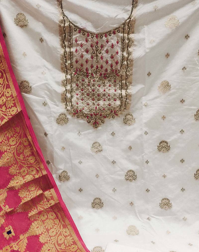 White banarasi hand embroidery dress material unstitched