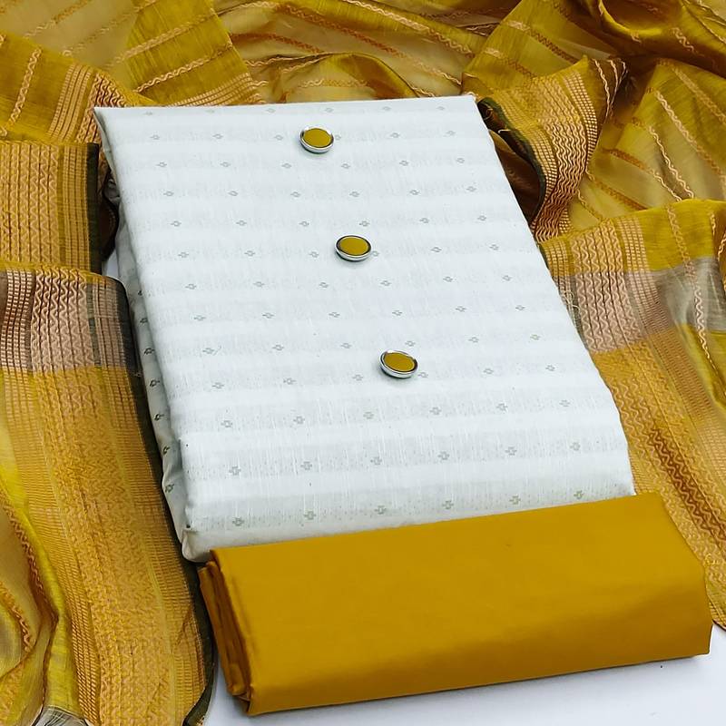 | Product Description | Dashing Weaving Straight Style 1.80 Mtr Unstitched Dress Material Top Of White Colour Cotton Jacquard Fabric Also Including 2.00 Mtr Chudidar Style Bottom Piece Material Of Mustered Colour Cotton Fabric With 2.00 Mtr Dupatta Of Mustered Colour Cotton Fabric |