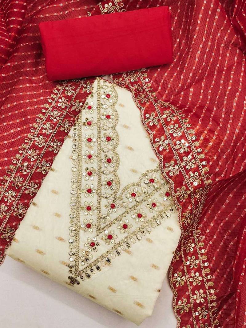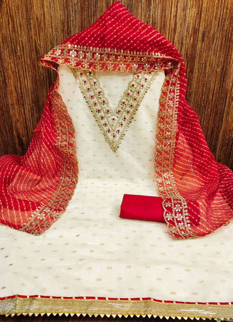 | Product Description | Weaving Fancy Neck And Royal Border With Leheriya Print Dupatta Straight Style 1.80 Mtr Unstitched Dress Material Top Of White Colour Modal Buti Fabric With 2 Mtr Santoon As Lining Inner Fabric Also Including 3.60 Mtr Unstitched Bottom Material Of Red Colour Santoon Fabric With 2.00 Mtr Dupatta Of Red Colour Kota Checks Fabric |