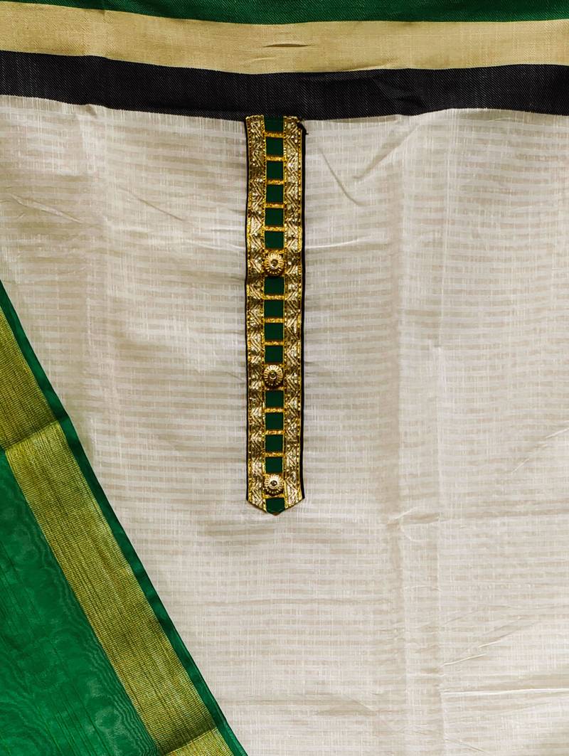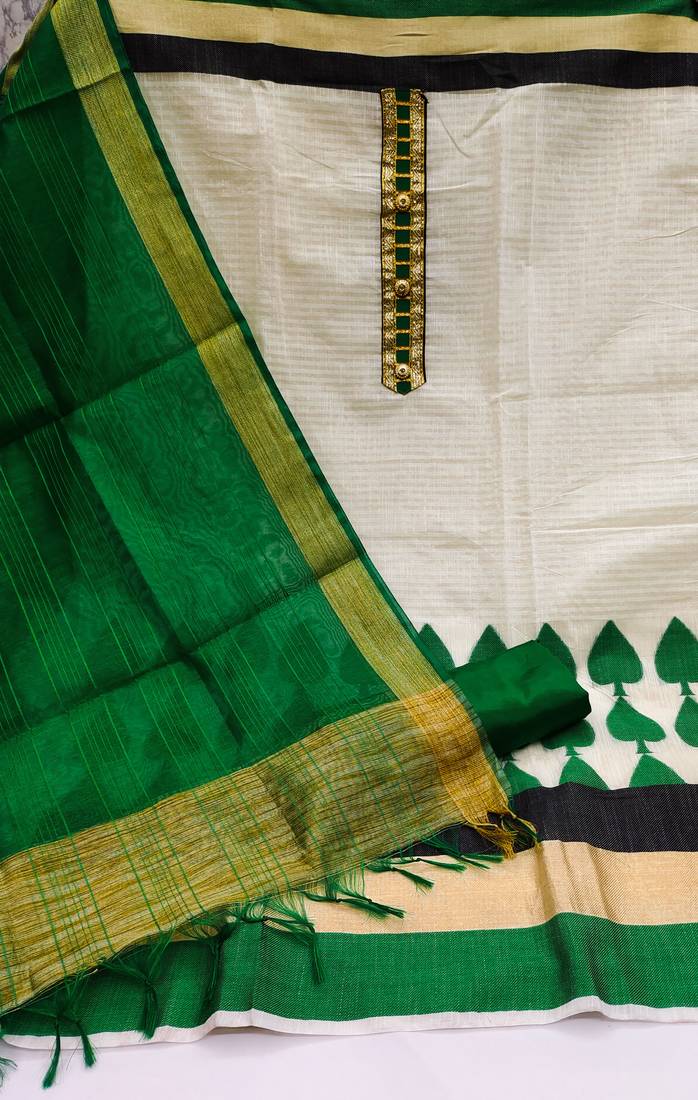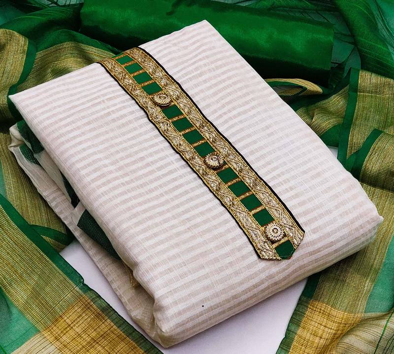 | Product Description | Weaving With Fancy Dupatta Straight Style 1.80 Mtr Unstitched Dress Material Top Of White Colour Banarasi Jacquard Fabric Suggestable Quarter Style Sleeves And Round Style Neck Also Including 2.00 Mtr Chudidar Style Bottom Material Of Green Colour Santoon Fabric With 2.00 Mtr Dupatta Of Green Colour Chanderi Cotton Fabric |