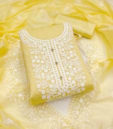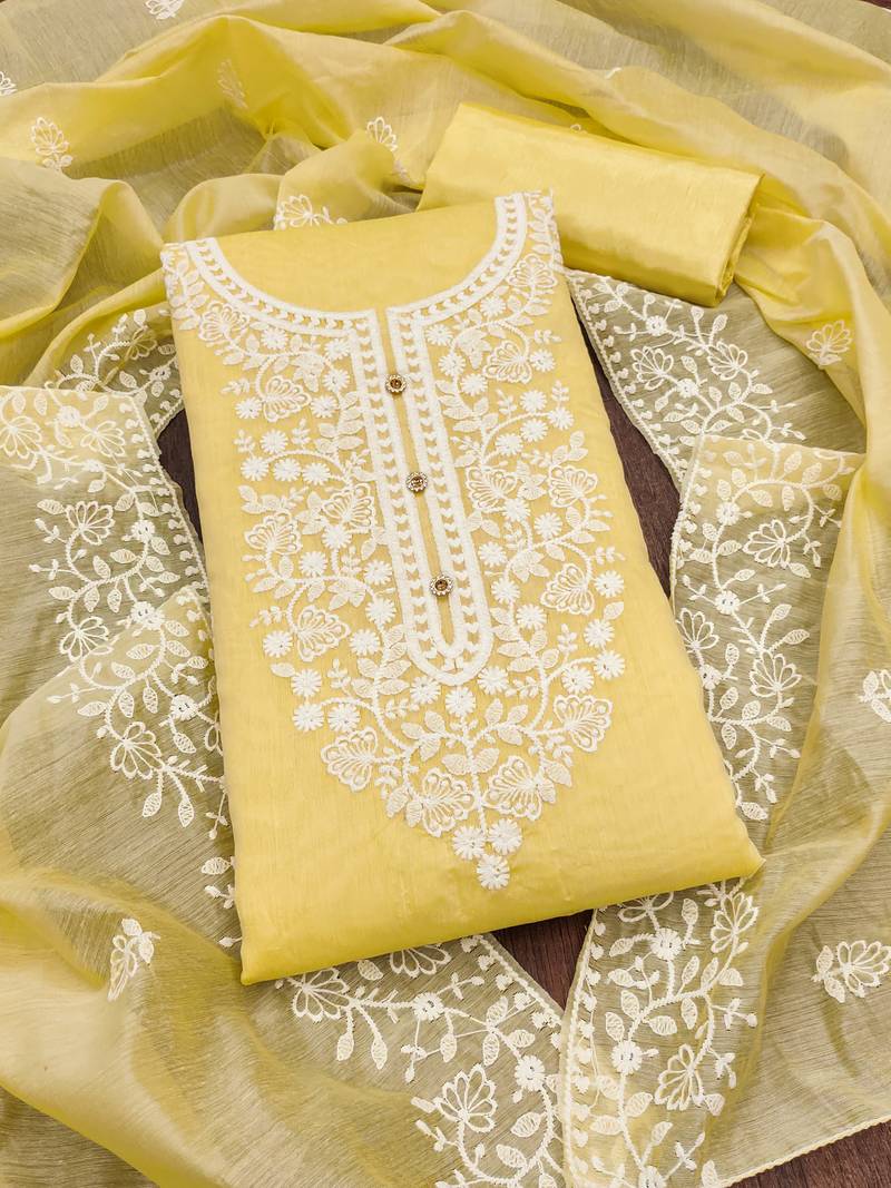 Yellow cotton embroidered dress material unstitched