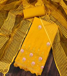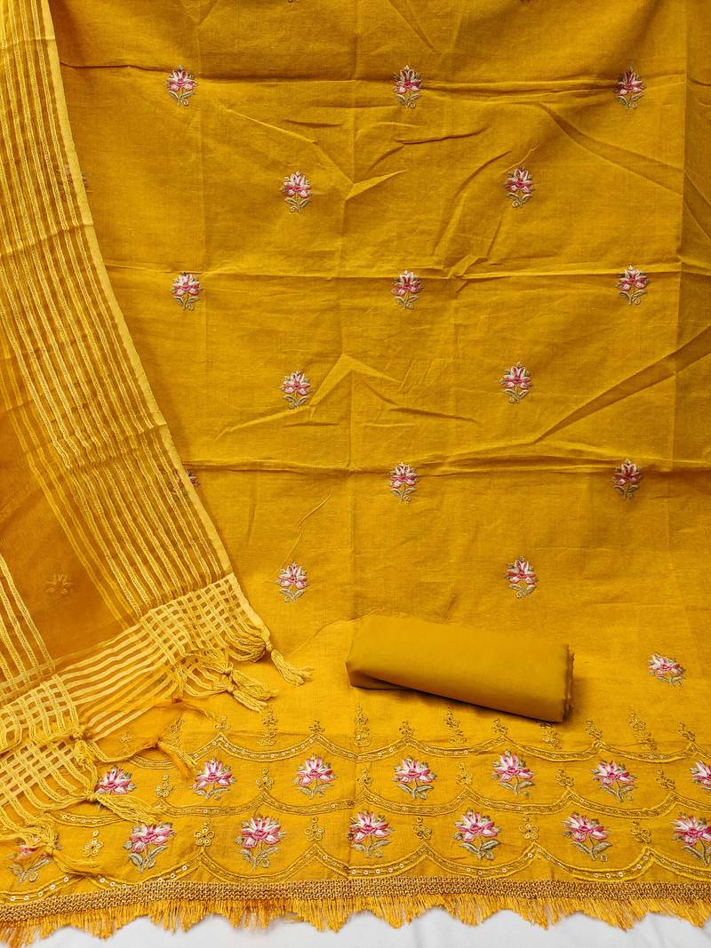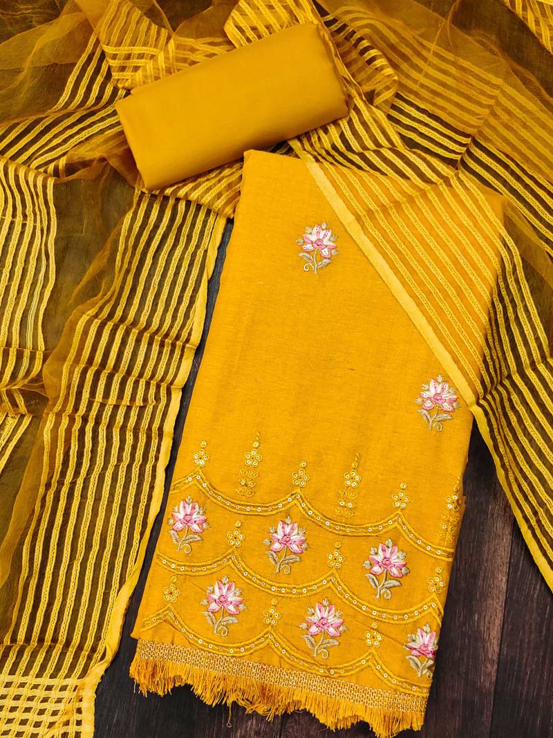 Yellow cotton embroidered dress material unstitched