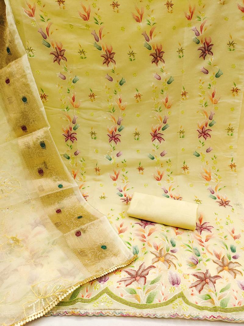 Yellow organza embroidered dress material unstitched