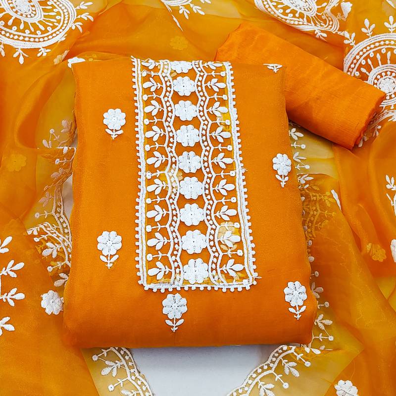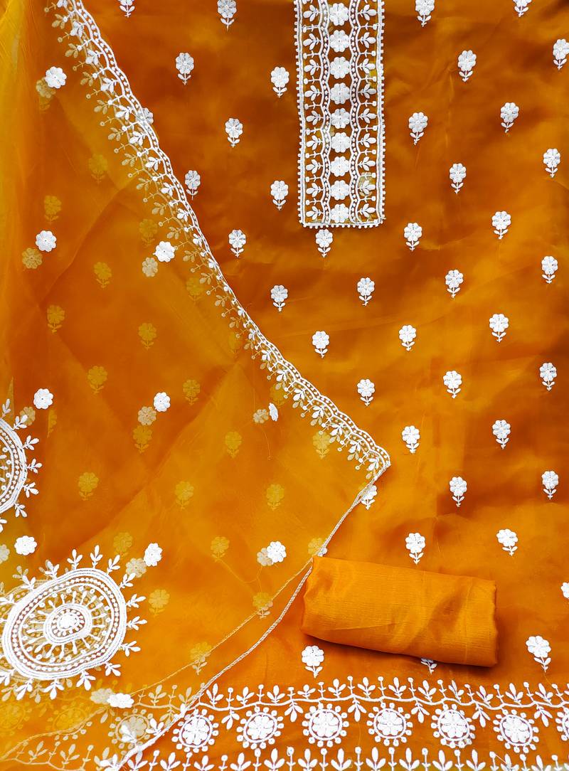 Yellow organza embroidered dress material unstitched