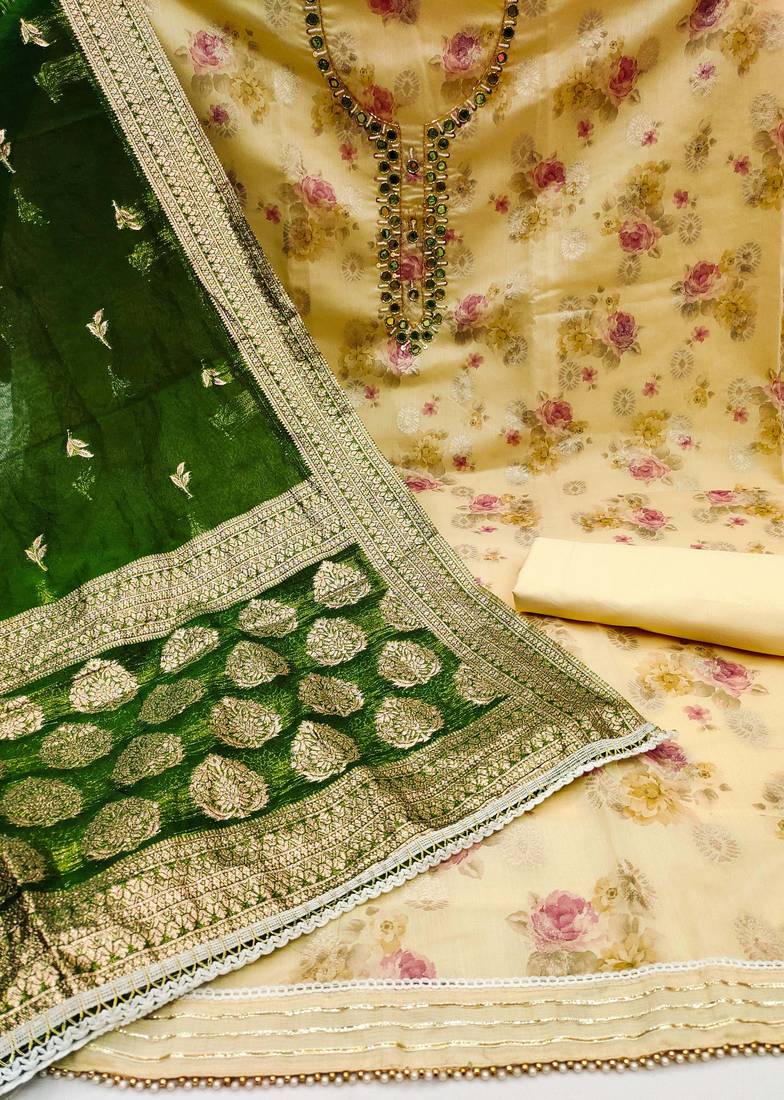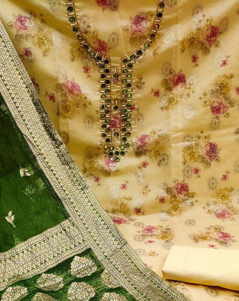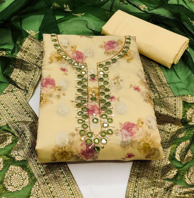 | Product Description | Digital Print And Fancy Weaving And Mirror Work With Banarasi Woven Work Dupatta Straight Style 1.95 Mtr Unstitched Dress Material Top Of Yellow Colour Cotton Jacquard Fabric With 2 Mtr Heavy Santoon As Lining Inner Fabric Also Including 3.80 Mtr Unstitched Bottom Material Of Yellow Colour Heavy Santoon Fabric With 2.05 Mtr Dupatta Of Green Colour Organza Jacquard Fabric |