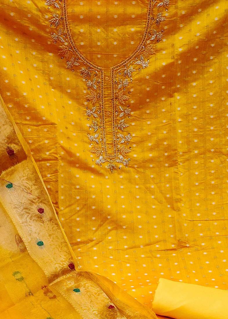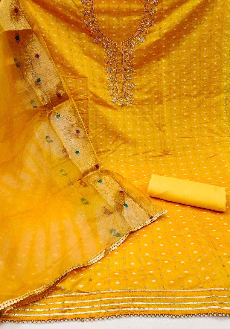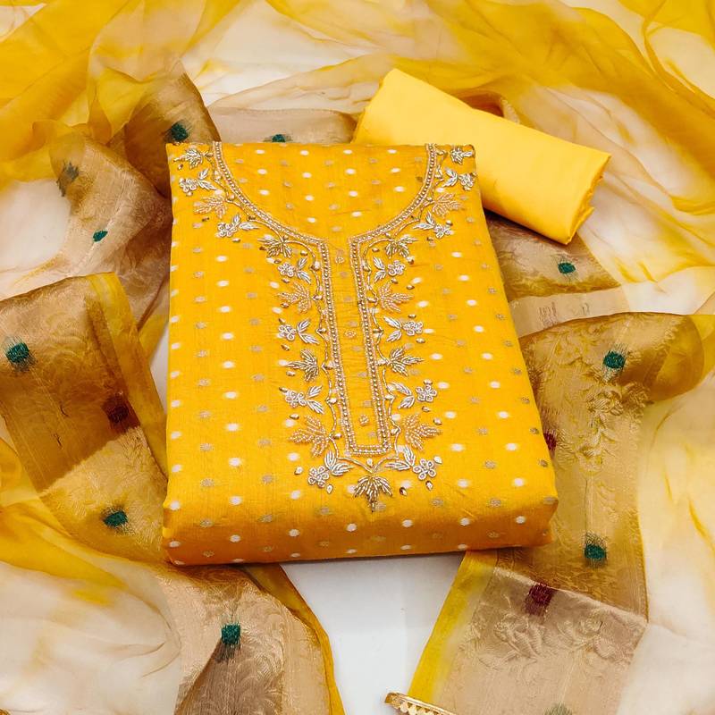 | Product Description | Fancy Fancy Weaving And Border And Hand Work With Organza Woven Dupatta Straight Style 1.85 Mtr Unstitched Dress Material Top Of Yellow Colour Modal Cotton Jacquard Fabric With 2 Mtr Santoon As Lining Inner Fabric Also Including 3.70 Mtr Unstitched Bottom Material Of Yellow Colour Santoon Fabric With 2.00 Mtr Dupatta Of Yellow Colour Organza Banarasi Fabric |