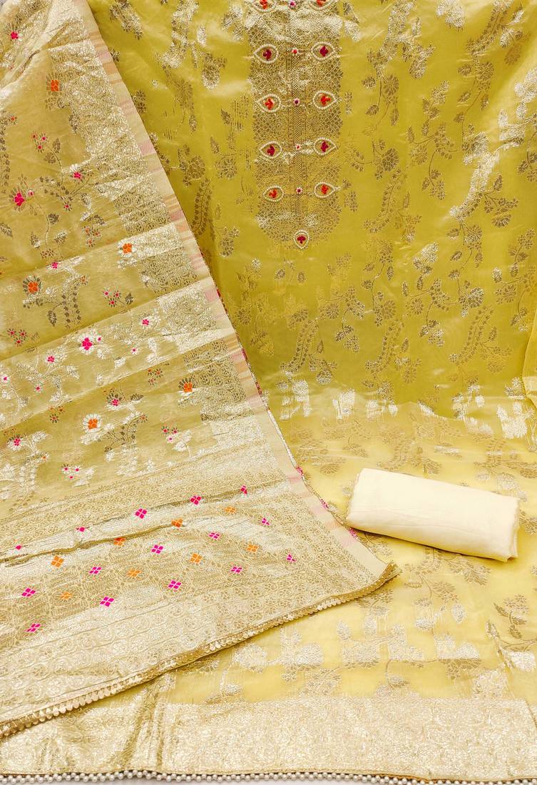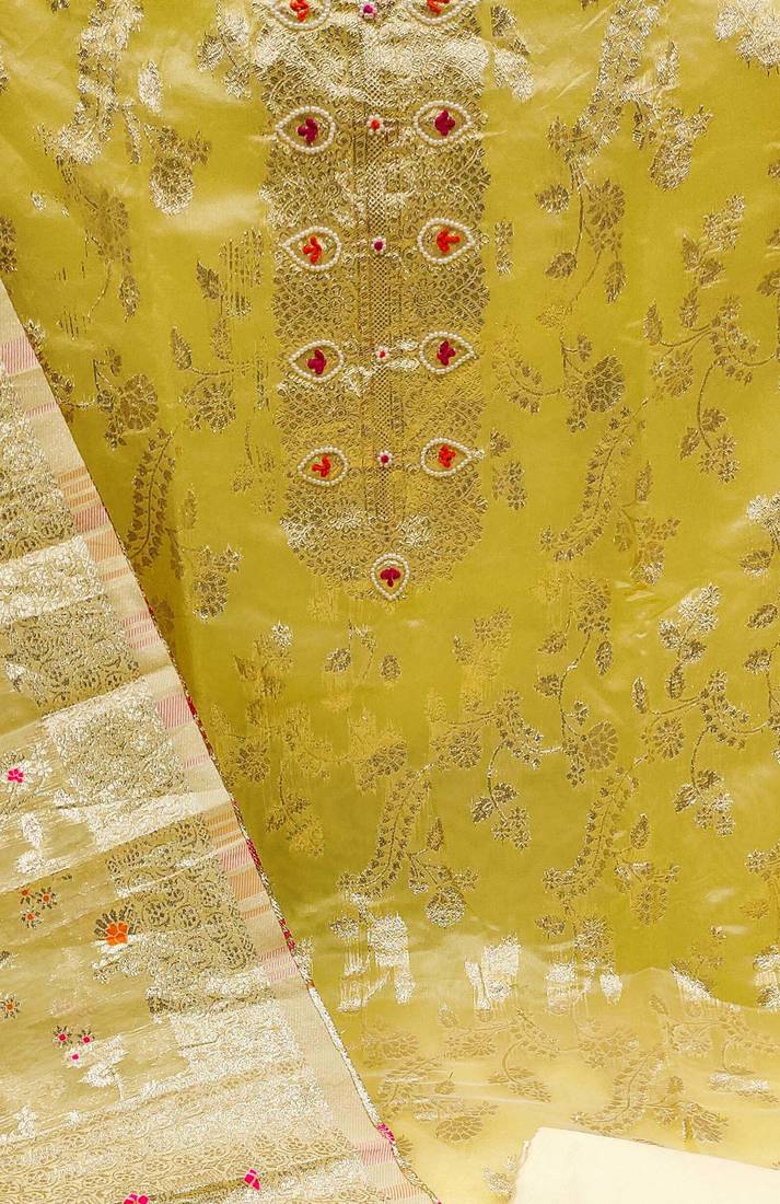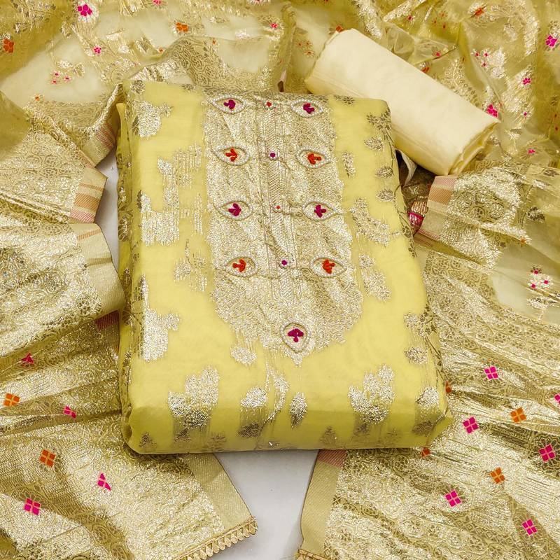 | Product Description | Banarasi Jari Weaving Work And Heavy Handwork With Weaving Work Dupatta Straight Style 1.95 Mtr Unstitched Dress Material Top Of Yellow Colour Banarasi Jacquard Fabric With 2 Mtr Heavy Santoon As Lining Inner Fabric Also Including 3.80 Mtr Unstitched Bottom Material Of Yellow Colour Heavy Santoon Fabric With 2.05 Mtr Dupatta Of Gold Colour Banarasi Jacquard Fabric |