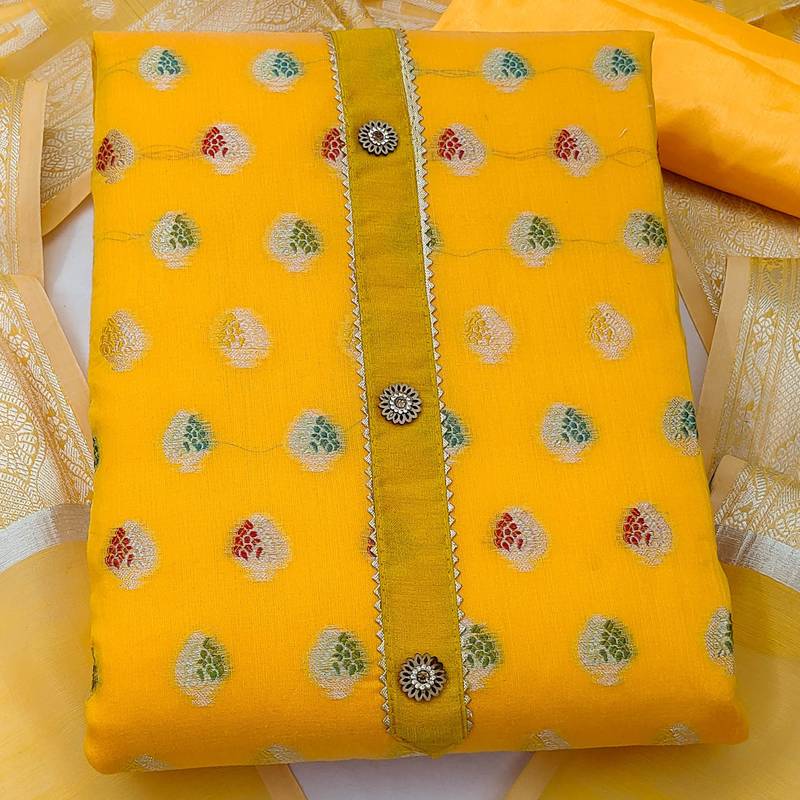Yellow jacquard woven dress material unstitched