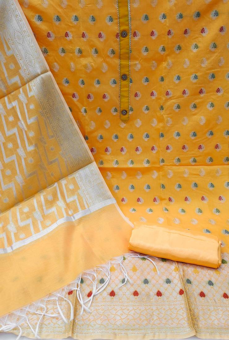 | Product Description | Weaving Straight Style 1.80 Mtr Unstitched Dress Material Top Of Yellow Colour Banarasi Jacquard Fabric With Inner Lining Fabric Of Santoon Also Including 2.00 Mtr Chudidar Style Bottom Piece Material Of Yellow Colour Santoon Fabric With 2.00 Mtr Dupatta Of Yellow Colour Banarasi Jacquard Fabric |