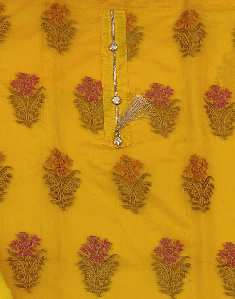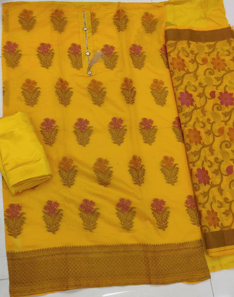 | Product Description | Weaving With Banarasi Jacquard Dupatta Straight Style 2.00 Mtr Unstitched Dress Material Top Of Yellow Colour Banarasi Jacquard Fabric Suggestable Quarter Style Sleeves And Round Style Neck Also Including 2.10 Mtr Chudidar Style Bottom Piece Material Of Yellow Colour Santoon Fabric With 2.00 Mtr Dupatta Of Yellow Colour Banarasi Jacquard Fabric |