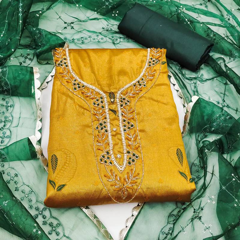 | Product Description | Weaving And Handwork With Embroidered Dupatta Straight Style 2.00 Mtr Unstitched Dress Material Top Of Yellow Colour Simmar Banarasi Jacquard Fabric Also Including 2.20 Mtr Chudidar Style Bottom Piece Material Of Green Colour Cotton Fabric With 2.00 Mtr Dupatta Of Green Colour Nazneen Fabric |