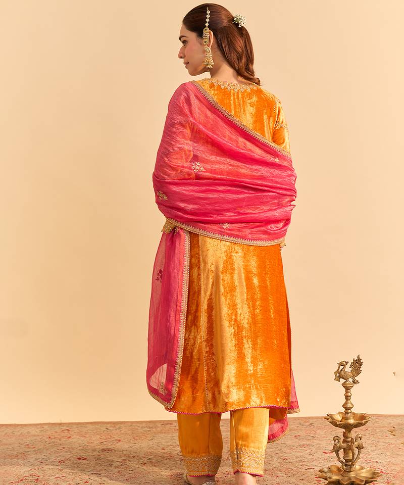 Orange embroidered velvet kurta set with dupatta