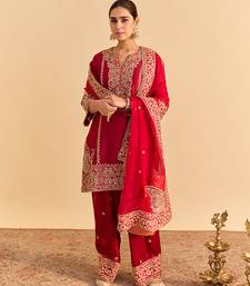 Red embroidered silk kurta set with dupatta
