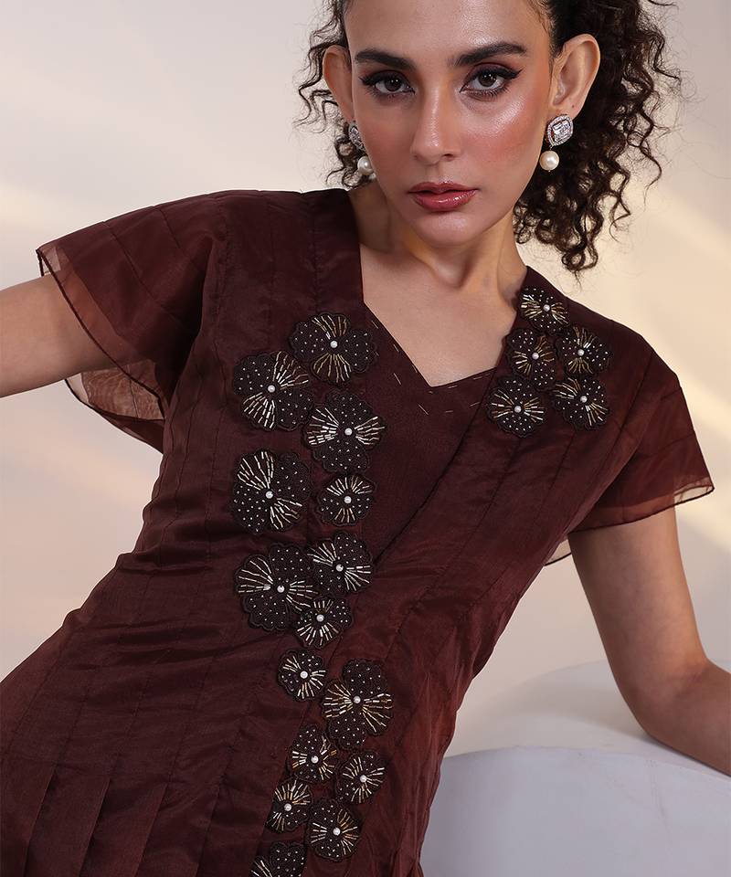 | Product Description | Elevate Your Occasion Wear With This Brown Embroidered Chinon Dress, Designed In Airy Chinon Fabric For Fluid Movement. Detailed Embroidery Enhances Its Elegant Appeal, While The Rich Brown Hue Adds Warmth And Sophistication, Making It Perfect For Festive Celebrations, Evening Events, And Special Gatherings.