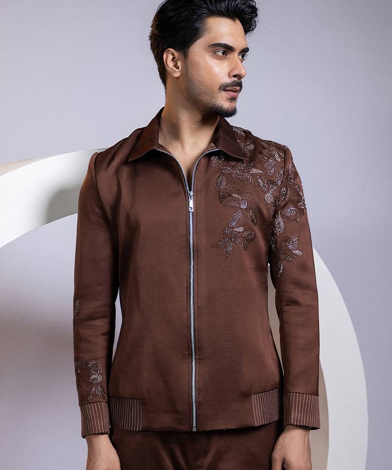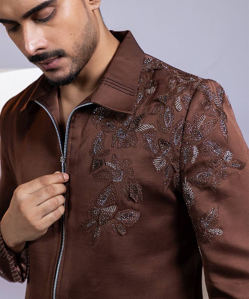 | Product Description | This Brown Embroidered Satin Bomber Jacket Blends Contemporary Style With Luxurious Elegance. Crafted From Smooth, High Quality Satin, It Features Intricate Embroidery That Adds A Refined, Eye Catching Detail. Perfect For Casual Outings, Parties, Or Festive Gatherings, It Offers A Chic, Modern Silhouette With Comfort, Versatility, And Sophisticated Appeal.