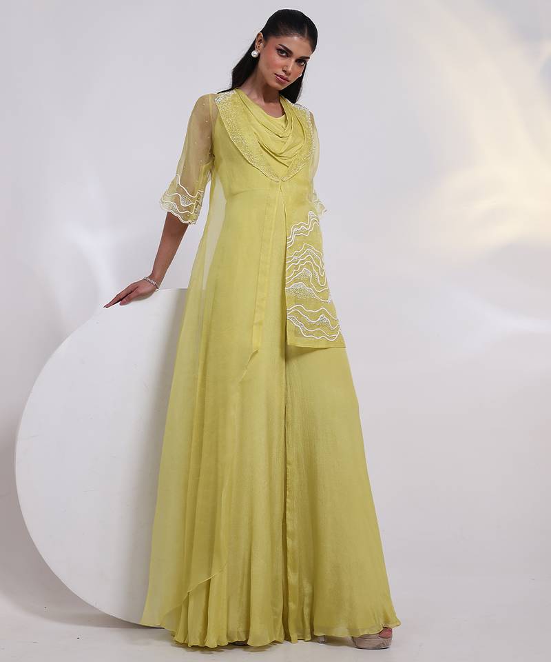 | Product Description | Elevate Your Festive Wardrobe With This Green Embroidered Chinon Jumpsuit, Designed In Flowy Chinon Fabric For Effortless Elegance. Featuring Intricate Embroidery, A Flattering Silhouette, And Graceful Drape, It Blends Contemporary Style With Ethnic Charm, Making It Perfect For Parties, Celebrations, And Special Occasions.