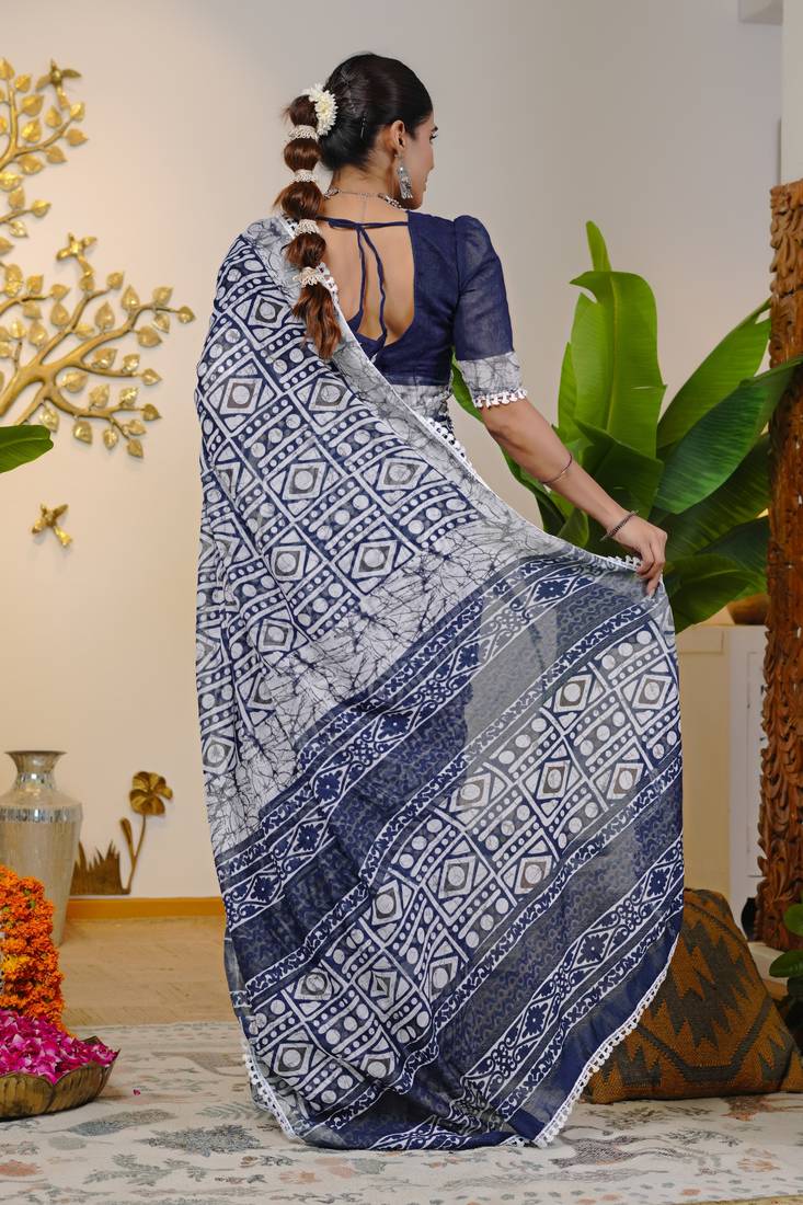 Cotton blend batik block print ready to wear saree with pocket navy blue