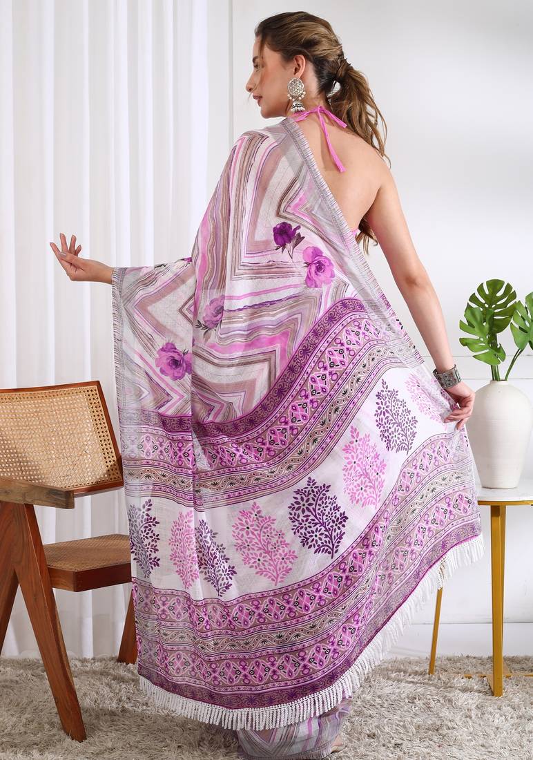 Cotton blend chevron floral print ready to wear saree with pocket white