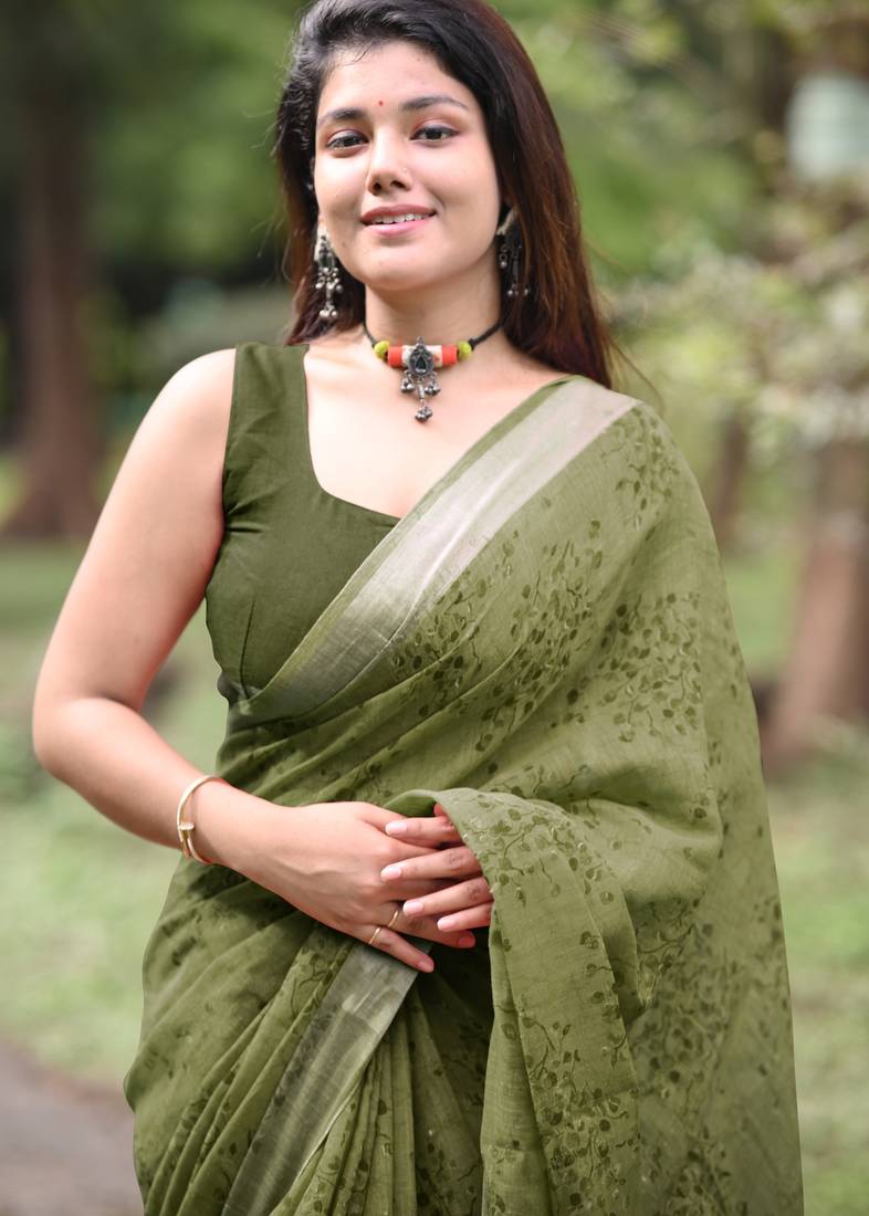 Cotton blend floral block print ready to wear saree with pocket olive green