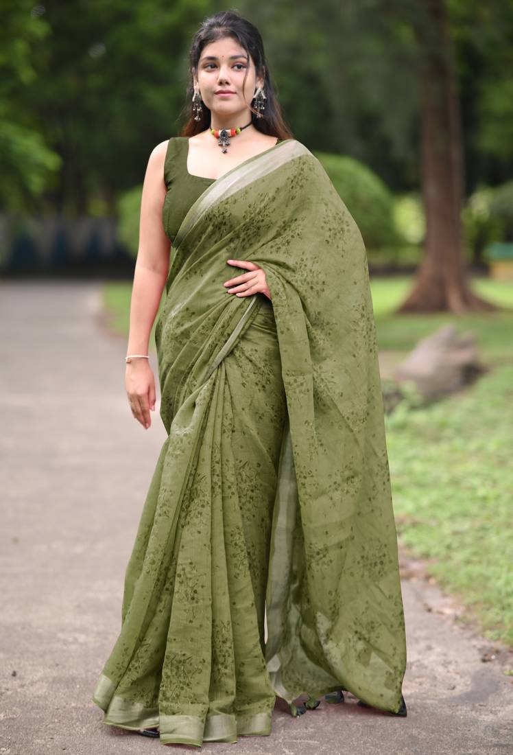 | Product Name | Cotton Blend Floral Block Print Ready To Wear Saree With Pocket Olive Green | |