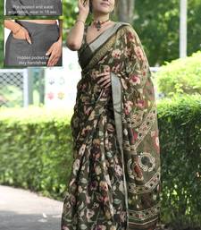Cotton blend floral print ready to wear saree with pocket mehandi green