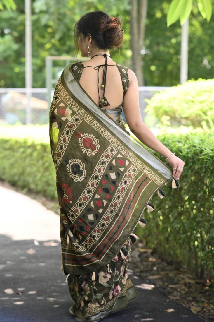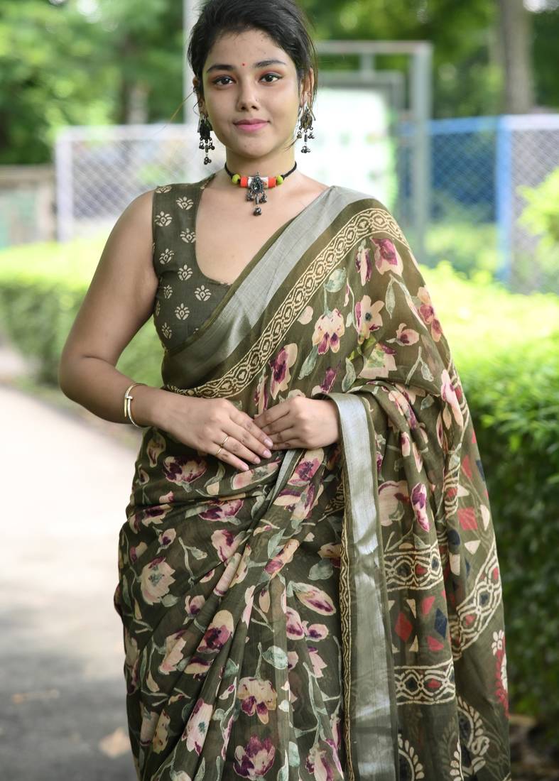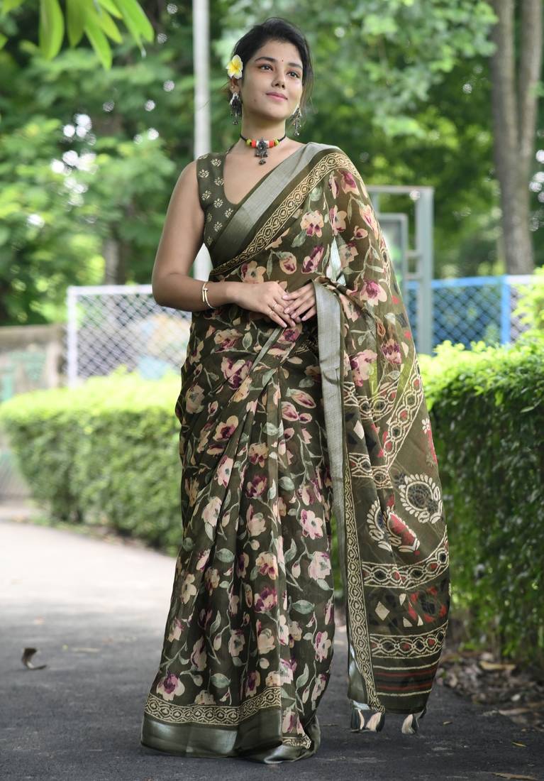| Product Name | Cotton Blend Floral Print Ready To Wear Saree With Pocket Mehandi Green | |