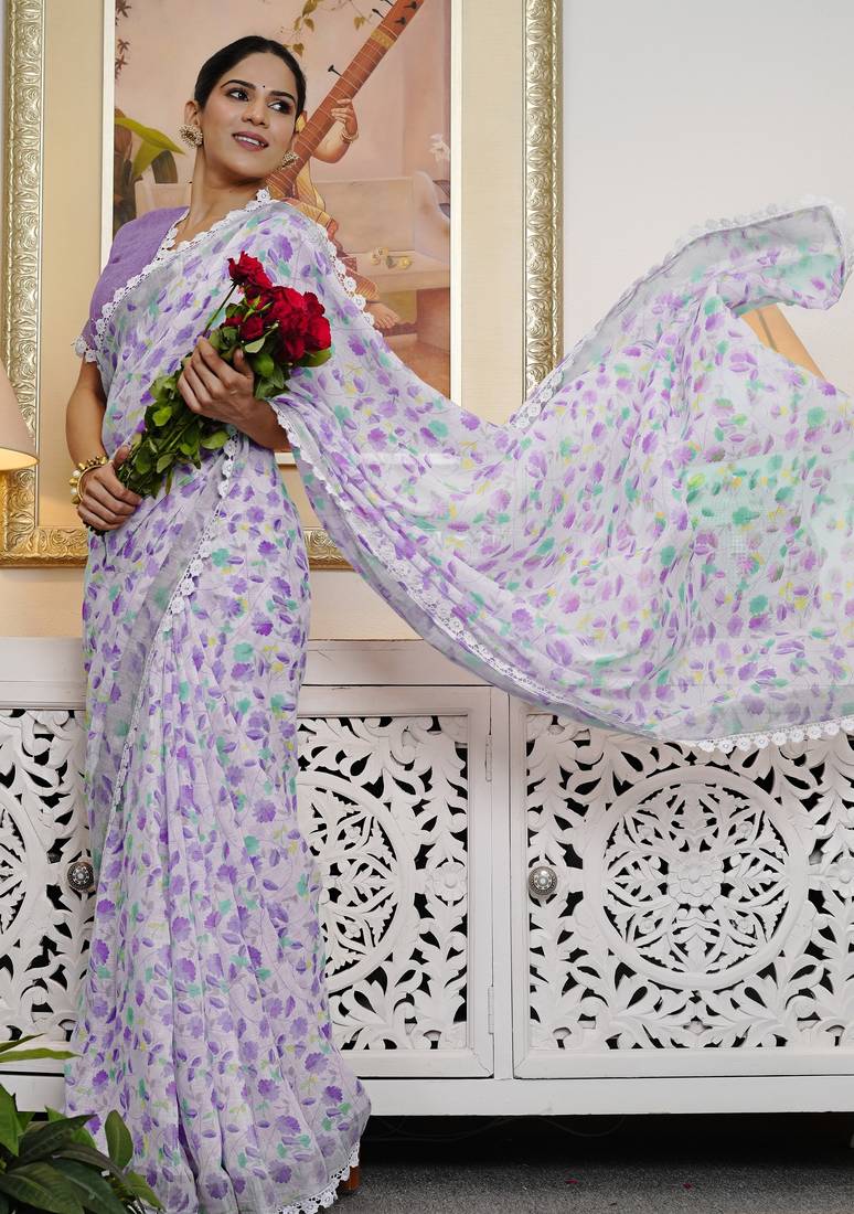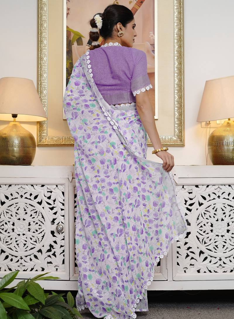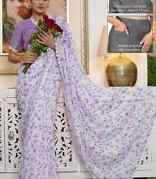 Cotton blend floral print ready to wear saree with pocket off white