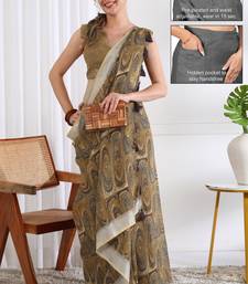 Cotton blend geometric print ready to wear saree with pocket dark beige