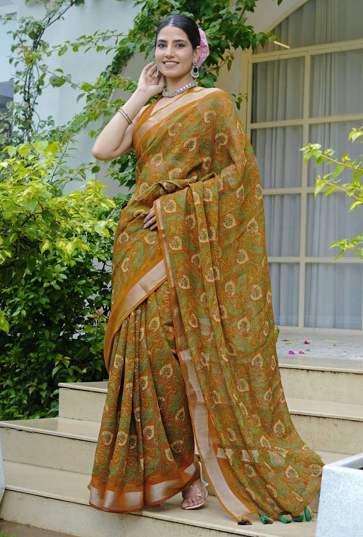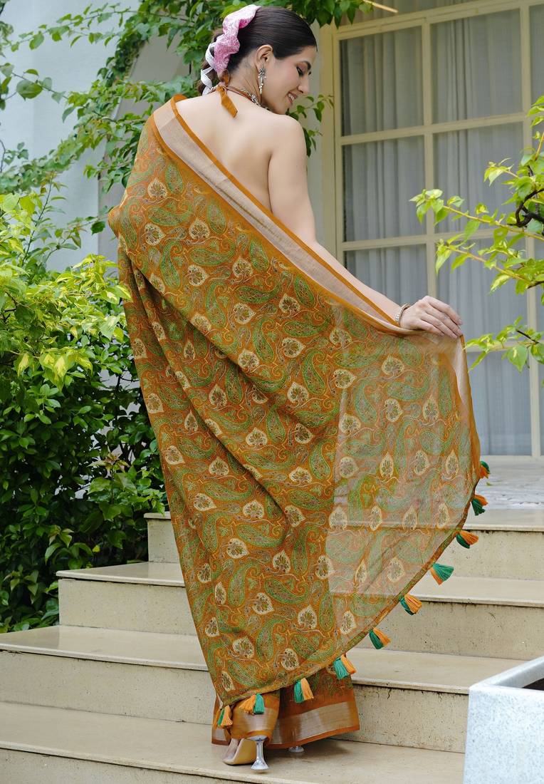 | Product Name | Cotton Blend Paisley Kalamkari Print Ready To Wear Saree With Pocket Dark Mustard | |