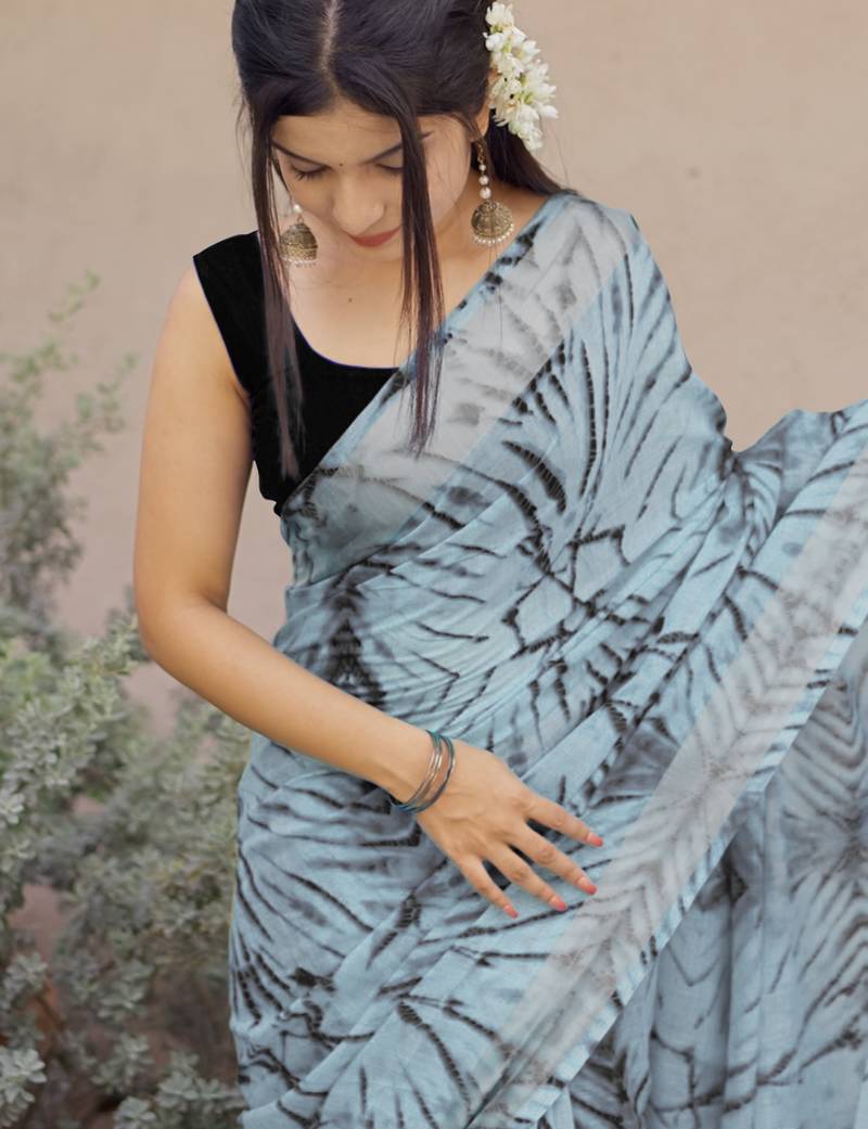 Cotton blend shibori print ready to wear saree with pocket light blue