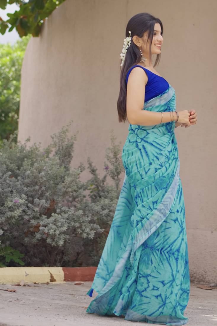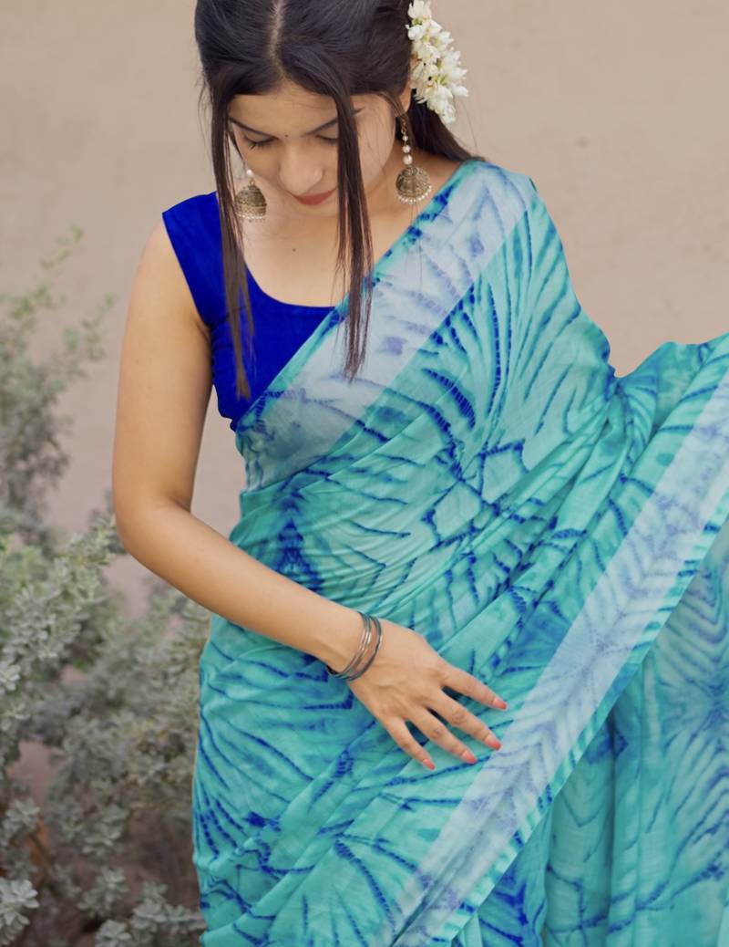 Cotton blend shibori print ready to wear saree with pocket turquoise