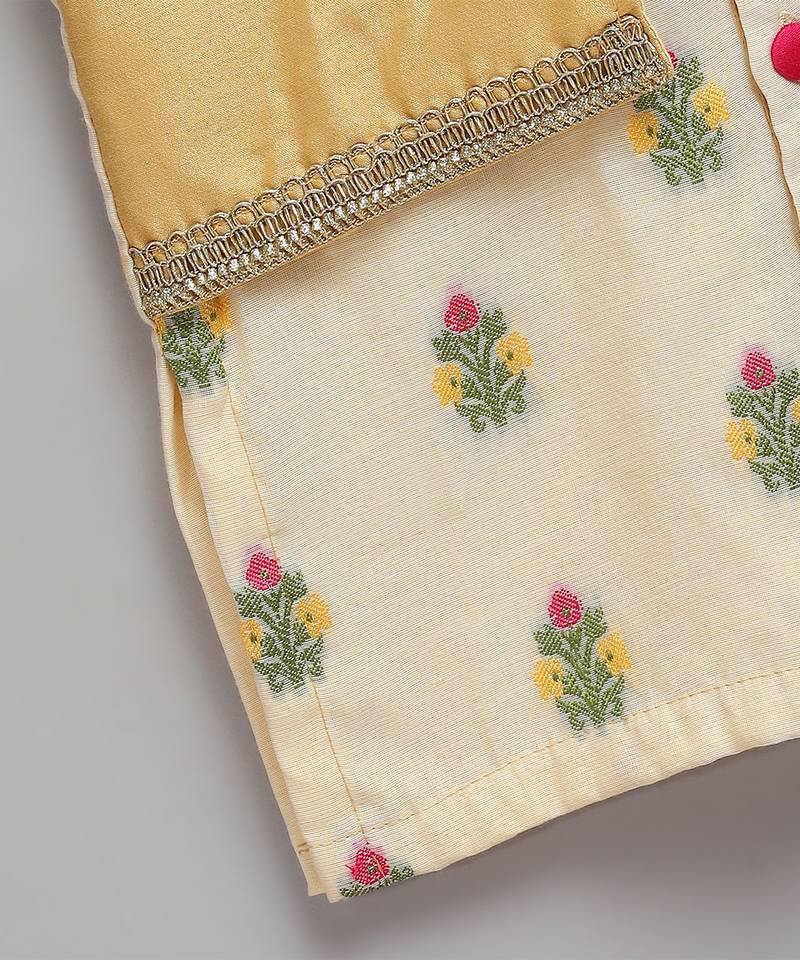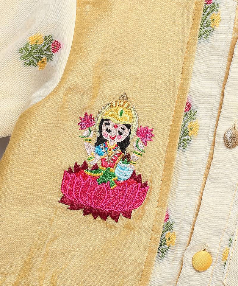 | Product Description | Beige Cotton Chanderi Booti Kurta With Front Opening. Attached Laxmi Goddess Embroidery Panel On One Side Of The Kurta .Lace Finishings. Pajama With Elastic