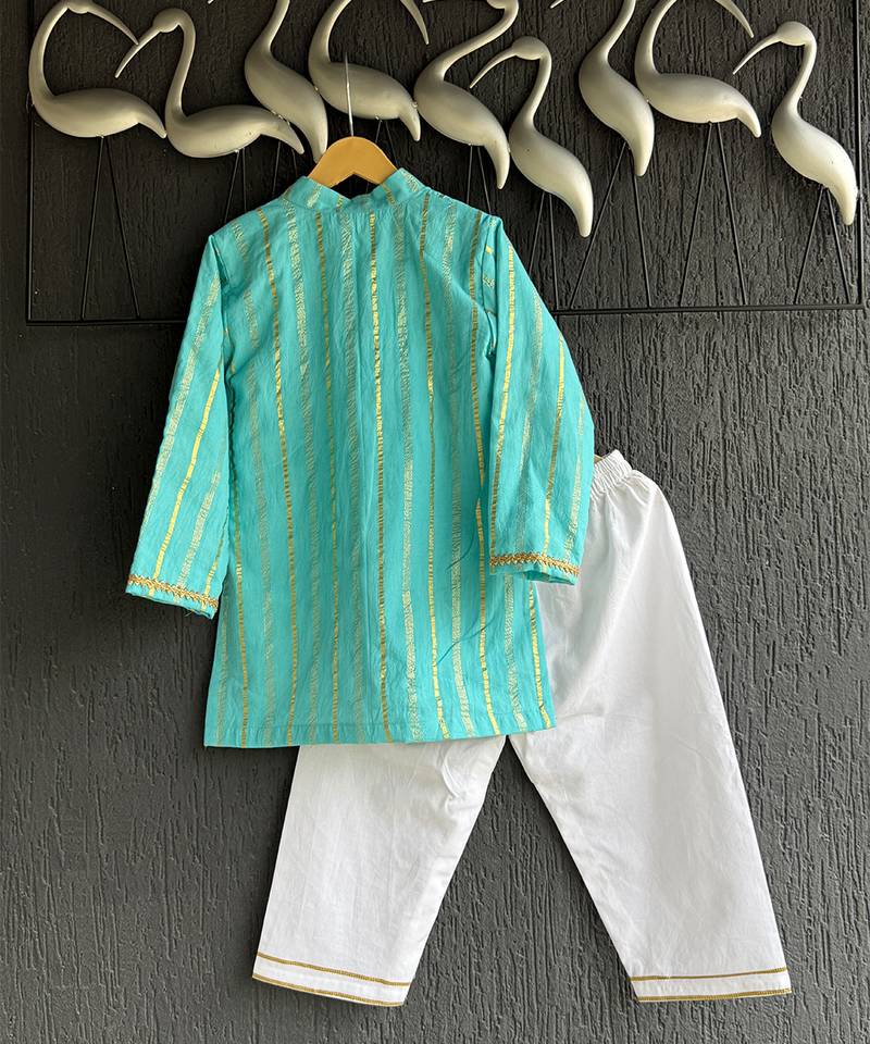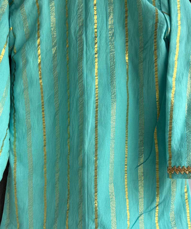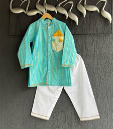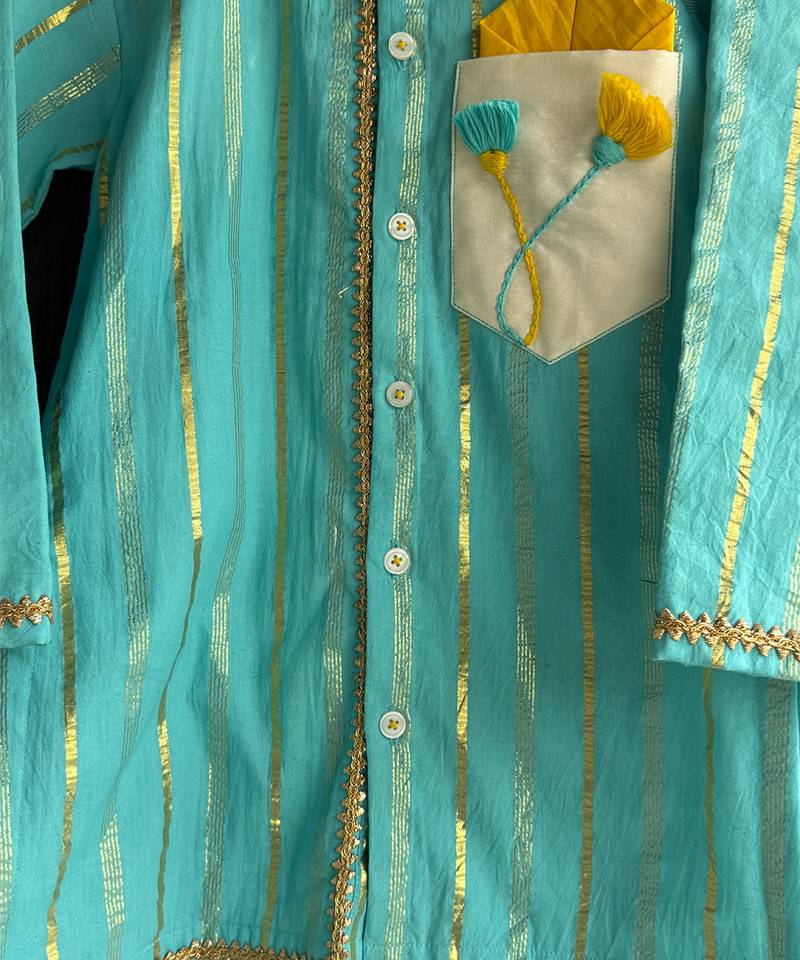 | Product Description | Blue Cotton Lurex Front Opening Kurta With Contrast Buttons. Kurta With Embroidered Anchor Thread Pocket Patch And Contrasting Pocket Square.Lace To Enhance The Look. Off White Elsaticated Waist.