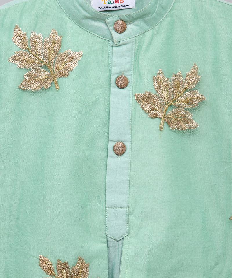 | Product Description | Pastel Green Kurta With Leaf Embroidered Embroidered Kurta With Full Sleeves. Kurta With Double Layered Attached Jacket.Kurta With Front Opening.. Bottom With Elasticated Waist.