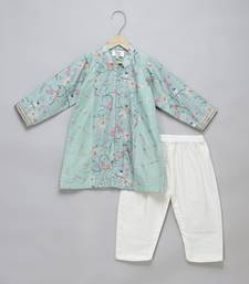 Green printed cotton silk kurta pyjama