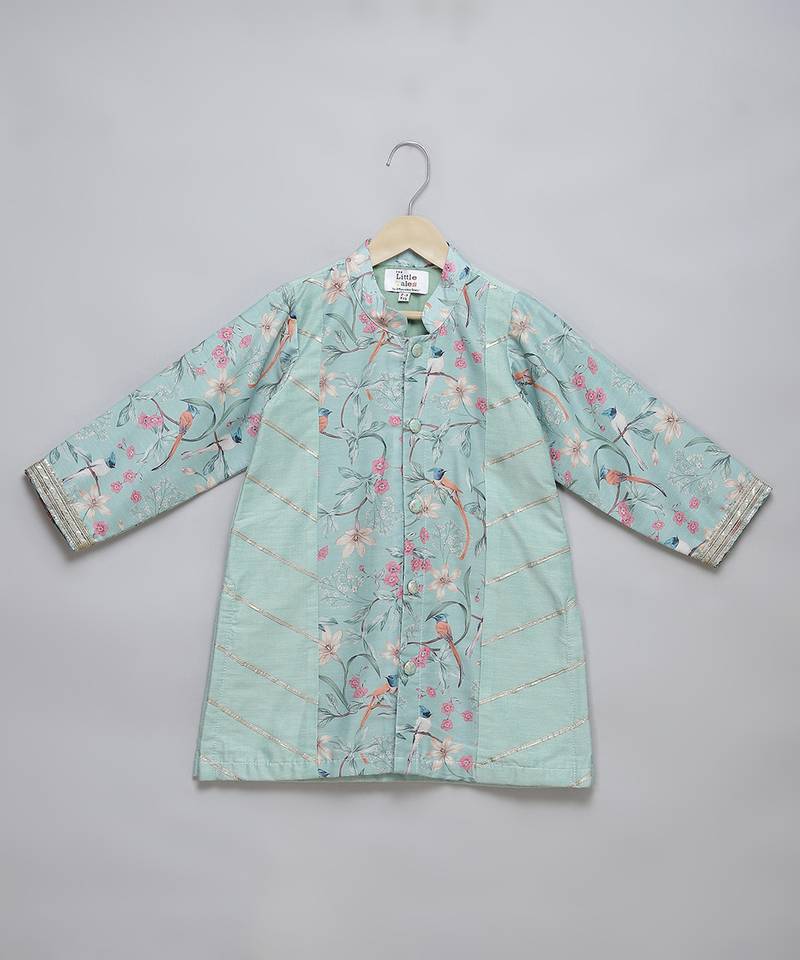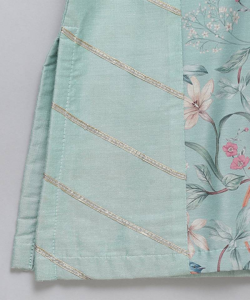 | Product Description | Pastel Green Cotton Silk Side Panel With Gota Embroidery Over It Attached With Printed Panels And Full Sleeves. Bottom With Elastic