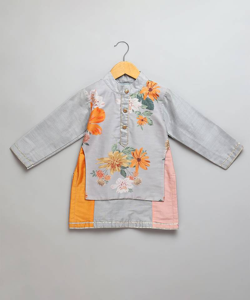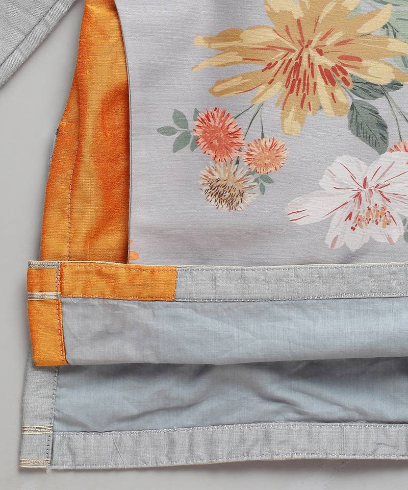 | Product Description | Multicolor Cotton Silk Kurta With Printed Attached Panel On Top . Front Placket Opening . Pajama With Elastic.