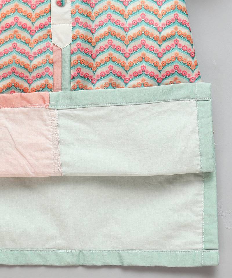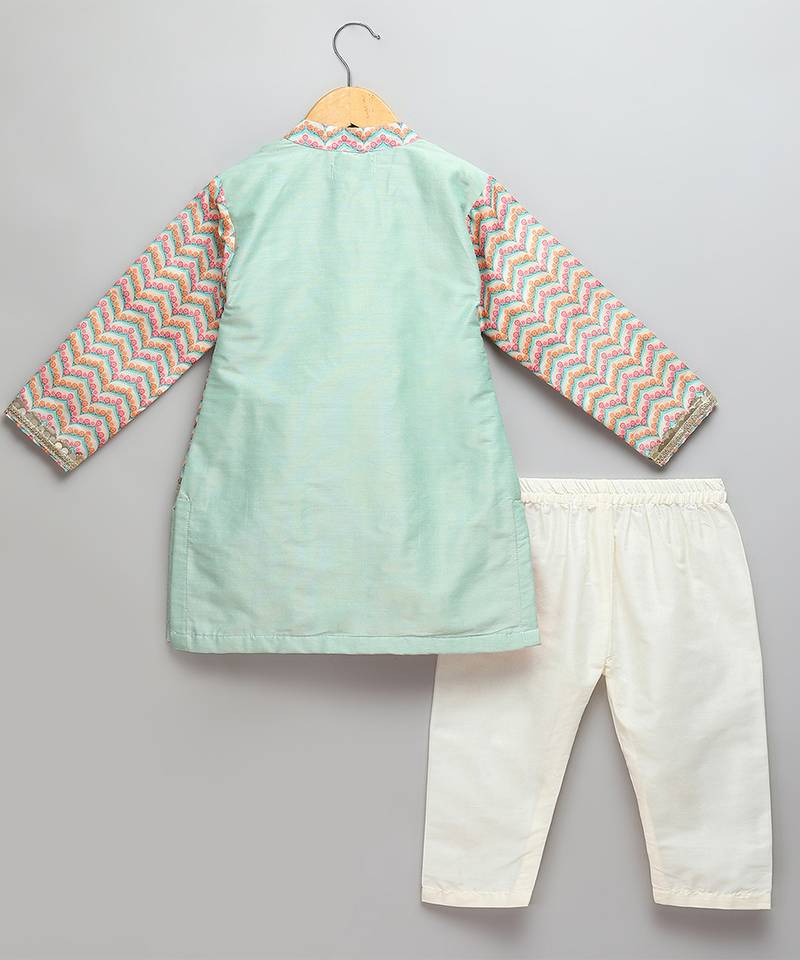 | Product Description | Multicolor Cotton Silk Kurta With Printed Attached Panel On Top . Front Placket Opening . Pajama With Elastic.