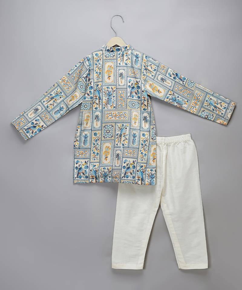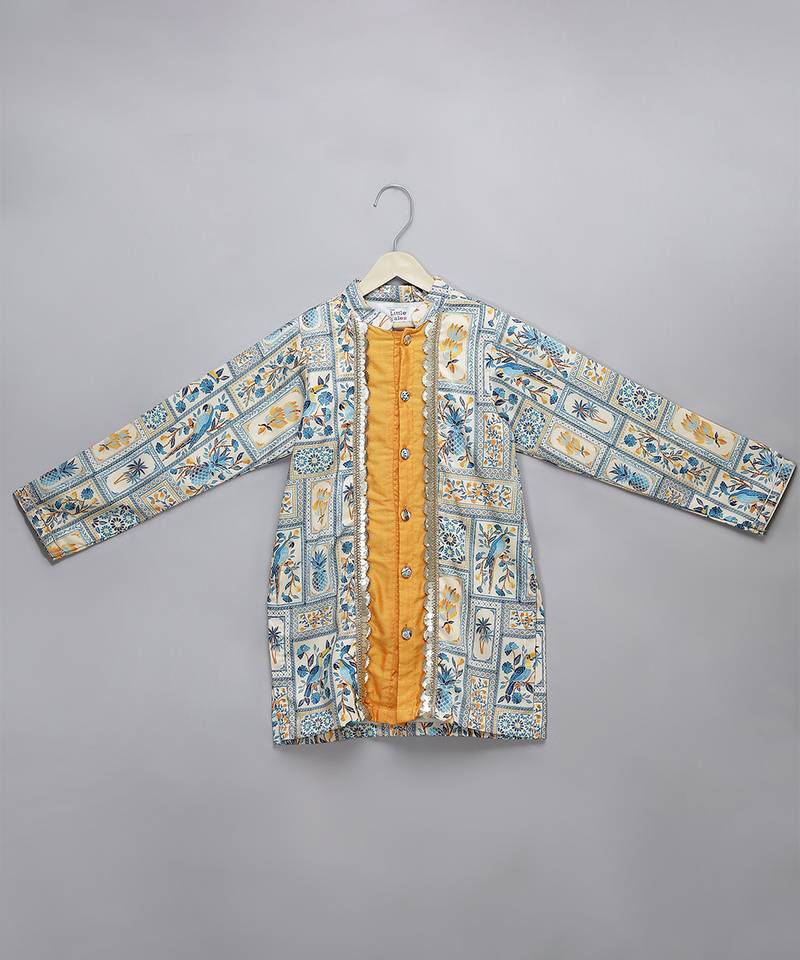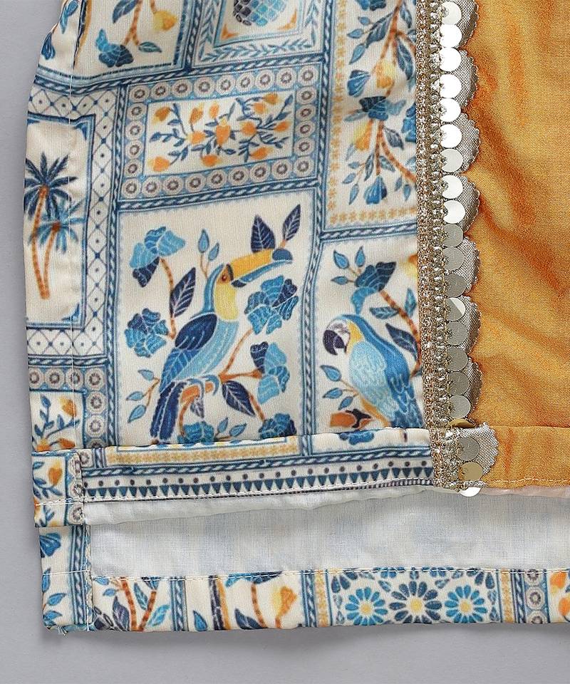 | Product Description | Blue Parrot Printed Kurta Panels On The Sided And Orange Panels On The Centre With Lace Embellishments. Kurta With Full Front Open Button Up.Bottom With Elastic.