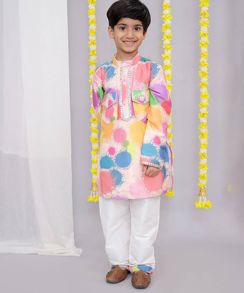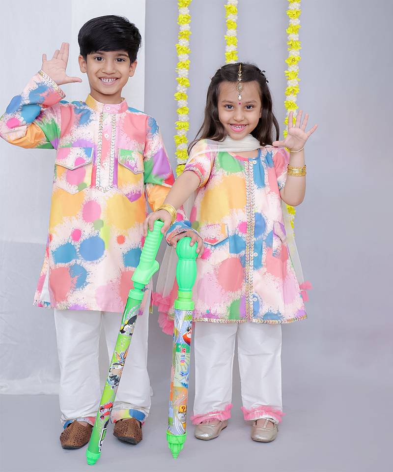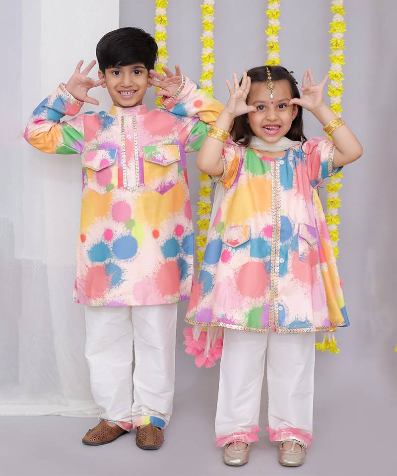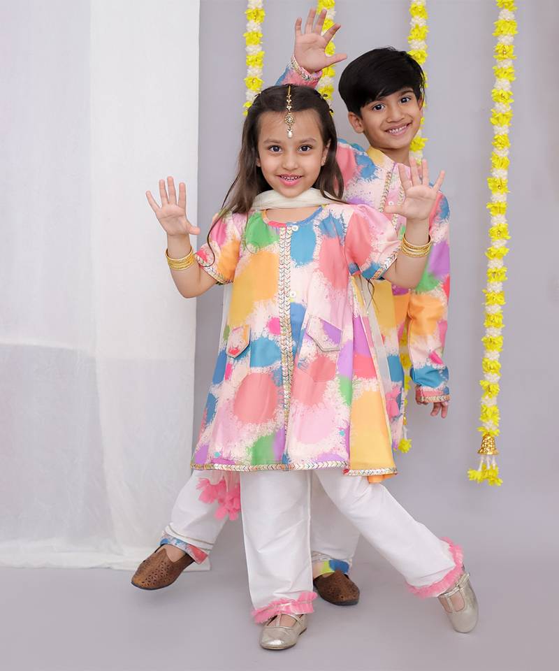 | Product Description | Multi Color Splash Printed Kurta With Lace Finishings And Patch Pockets On Both Sides. Kurta With Full Sleeves.Kurta With Fornt Opening .Kurta With Cotton Lining. Matching Cotton Lining With Lace Finishings . Bottom With Elasticated Waist And Printed Border .