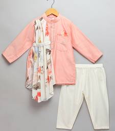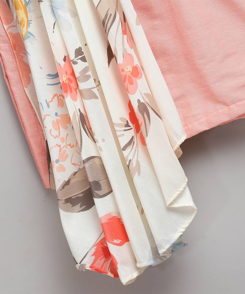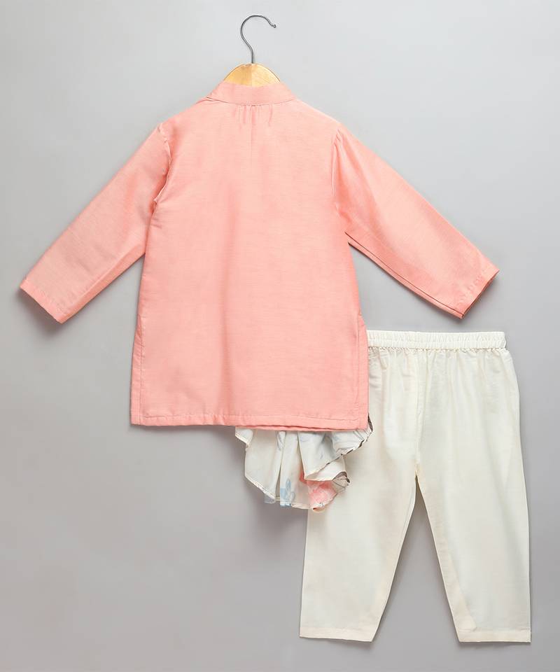 | Product Description | Peach Cotton Silk Kurta With Front Opening. Attached Printed Pleat Panel Stitched Assymetrically. Pajama With Elastic