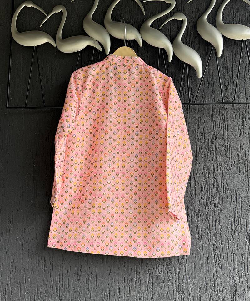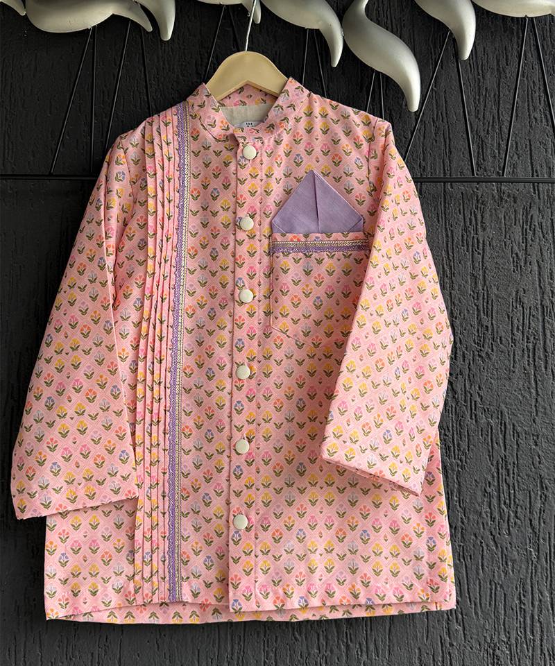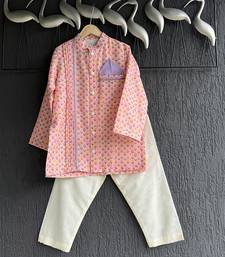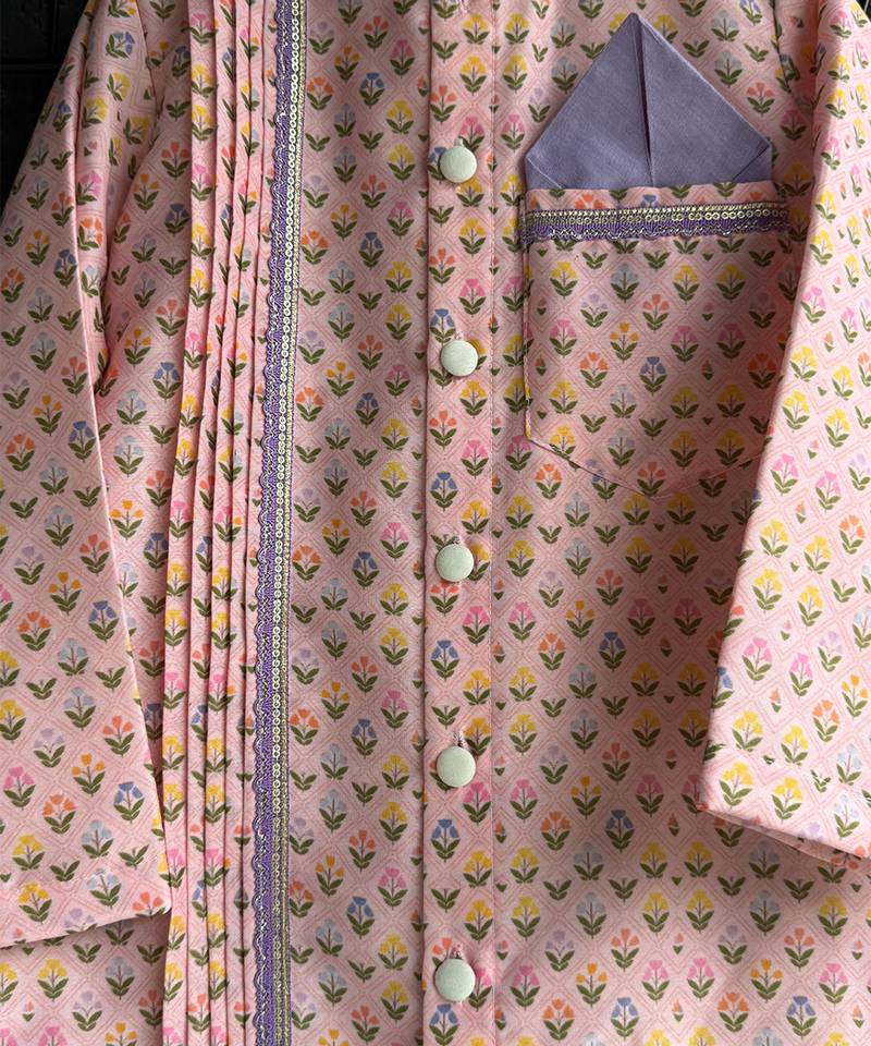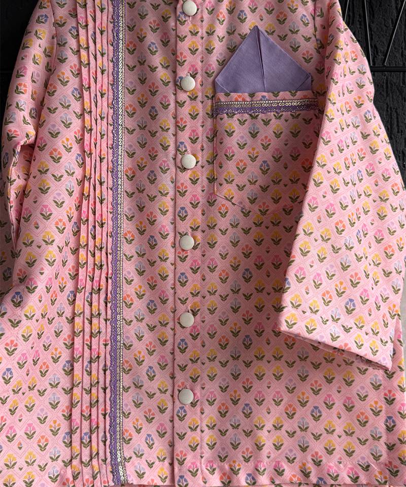 | Product Description | Kurta Pajama Set Featuring A Pastel Pink Printed Kurta With Mandarin Collar, Button Down Front, And Pleated Detailing On One Side. It Is Paired With Cream White Pajama Pants For A Classic Traditional Look. The Kurta Also Includes A Lavender Pocket Square Accent, Adding A Touch Of Elegance. Perfect For Festive Occasions, Weddings, And Cultural Celebration