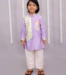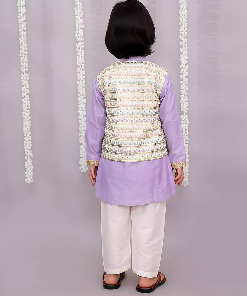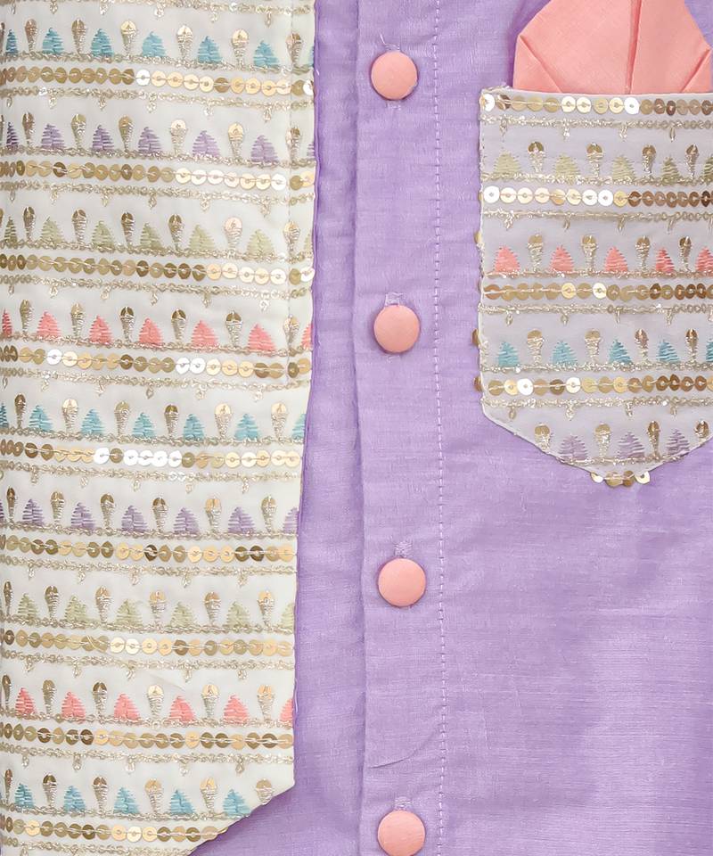 | Product Description | Lavendar Kurta Set With Embroidery Attached Jacket On Top .Kurta Comes With Soft Cotton Lining. Kurta Comes With Fabric Buttons. Pyjama In Off White Cotton Silk With Elasticated Waist.