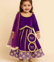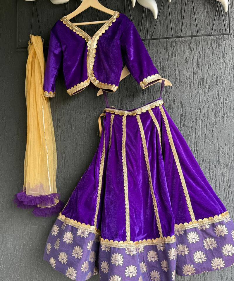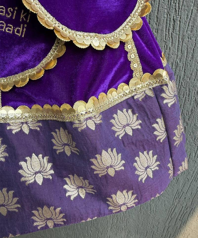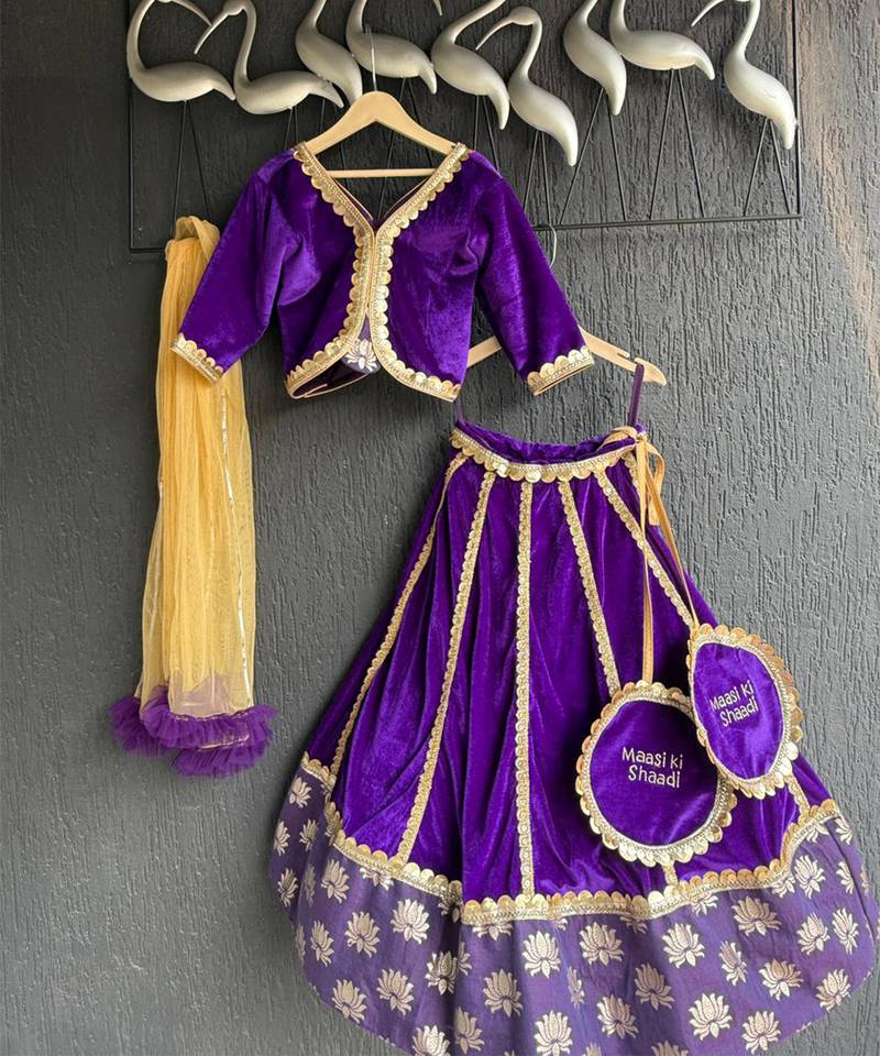| Product Description | Purple Velvet Maasi Ki Shaadi Customised Lehnga Set With Cotton Linings Benath And Lace To Highlight The Sme. Lehnga With Kalis Enhanced With Lace On The Same. "Mama Ki Shaadi " " Chachu Ki Shaadi" Maasi Ki Shaadi "Tassels On The Lehnga To Give A Customised Look.For Any Customisations Contact Us On 9389741726.