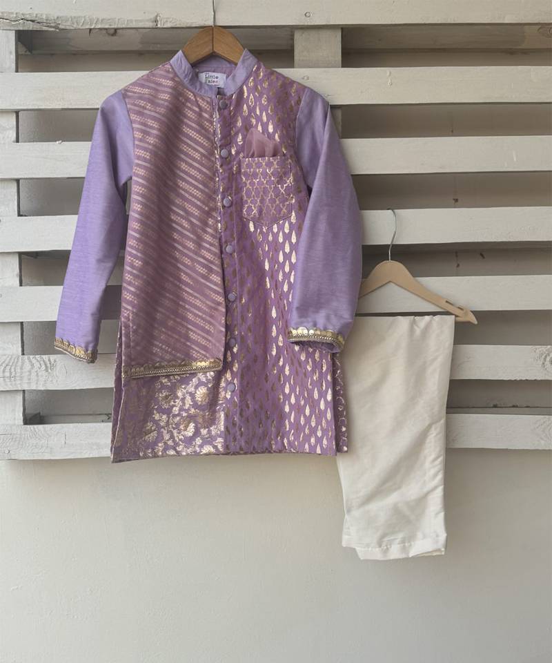 | Product Description | Pastel Purple Organza Kurta With Cotton Lining.Kurta With Front Opening. Attached Cotton Zari Panels On The Kurta .With Pocket .And Off White Pajama With Elastic.