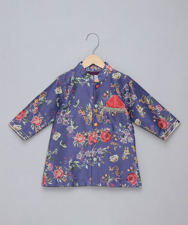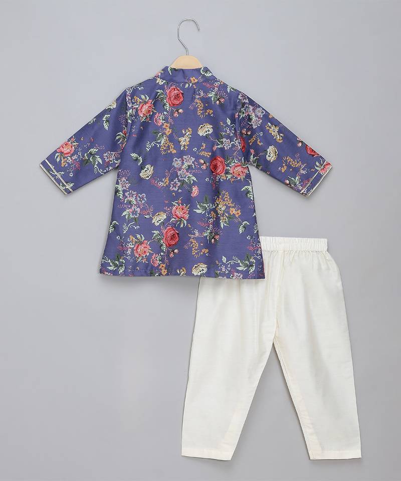 | Product Description | Purple Digital Printed Front Open Multicolor Cotton Silk Kurta With Multi Color Buttons. Front Placket Opening . Pajama With Elastic.