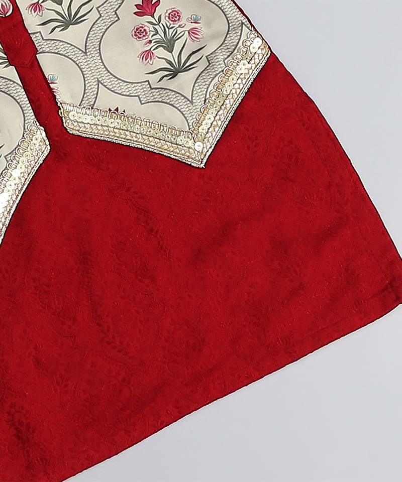 | Product Description | Mughal Printed Atttached Jacket With Jaquard Front Open Kurta And With Off White Pyjama