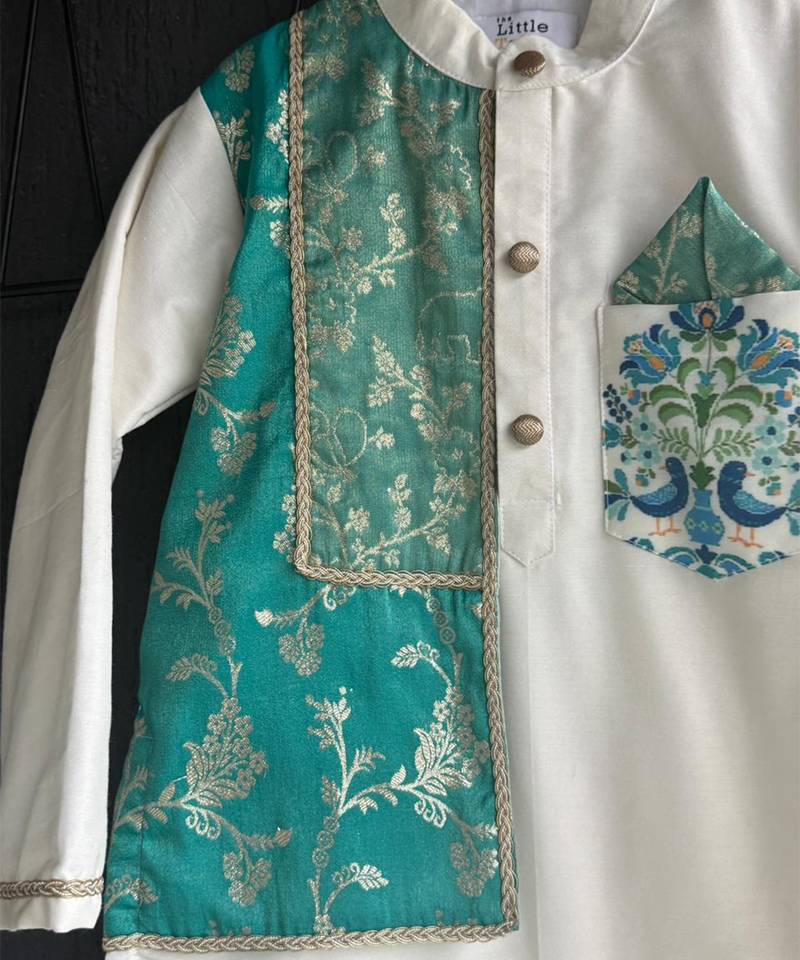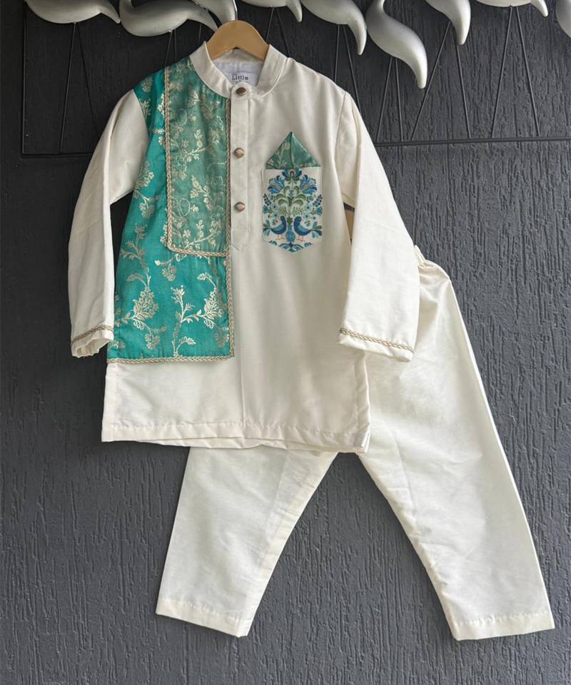 | Product Description | Off White Kurta Set With Two Shades Of Green Chanderi Panels Over On One Side Of The Kurta . Kurta With Printed Pocket And Front Opening . Bottom Comes With Elasticated Waist.