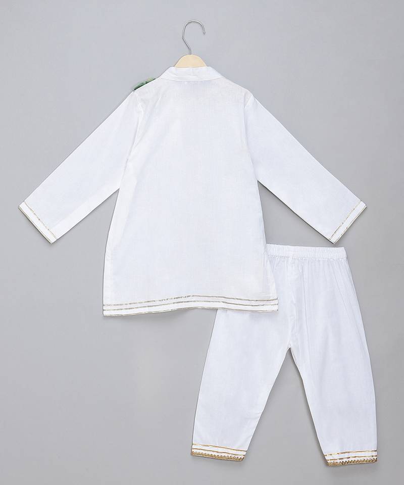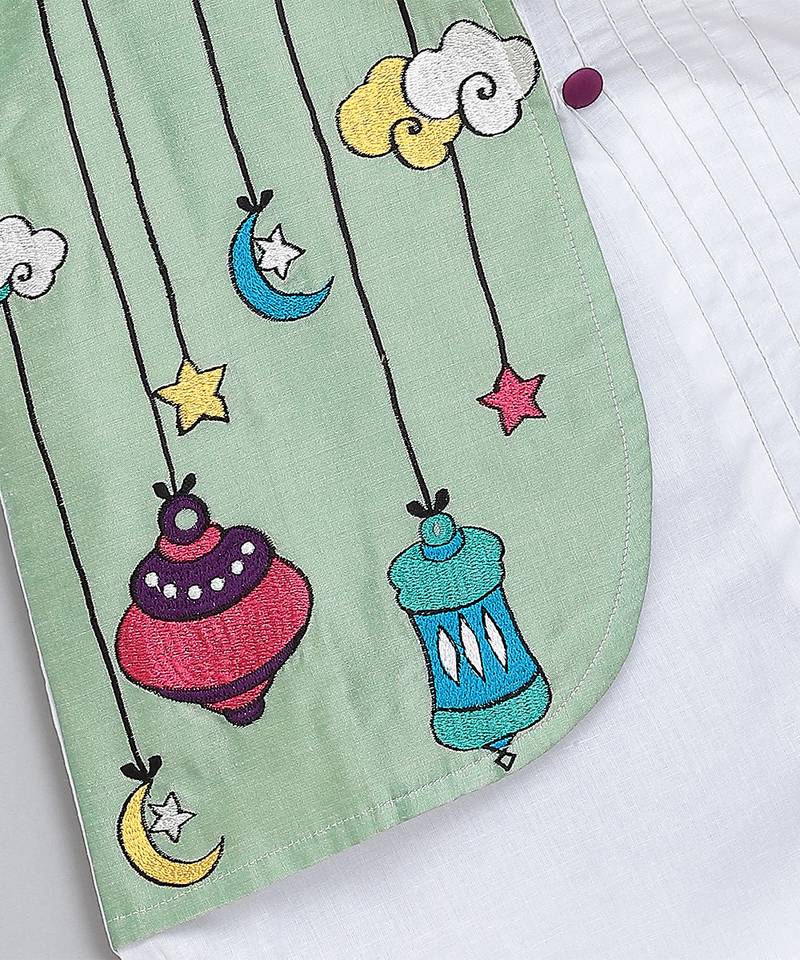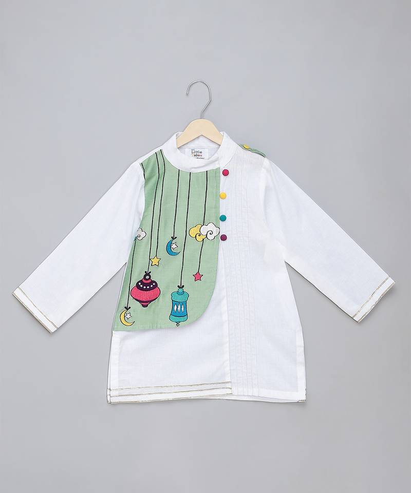 | Product Description | White Cotton Poplin Kurta Pyjama Set With Eid Elements Embroidered Palla Over One Side Of The Kurta . Pyjama With Elasticated Waist.