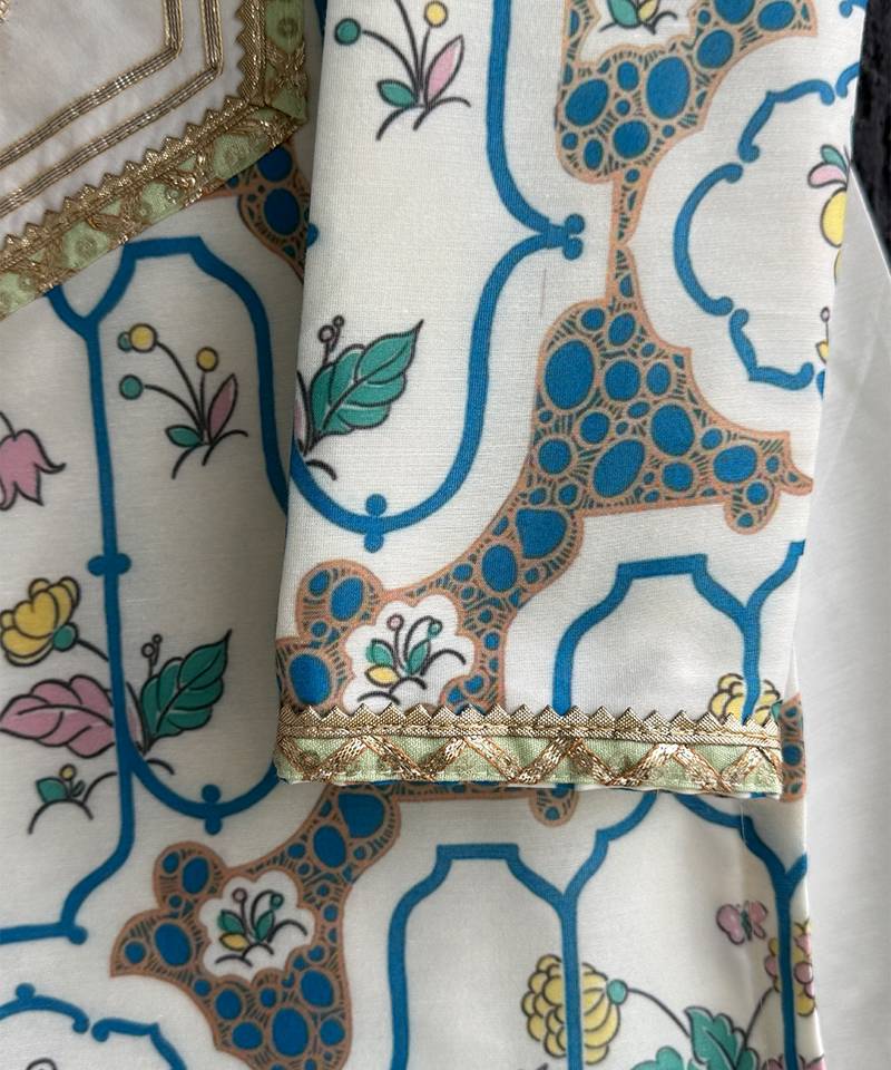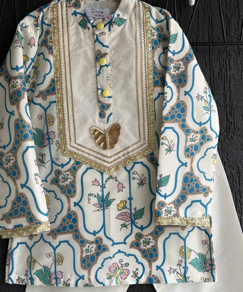 | Product Description | Butterfly Printed Kurta Set With A Gold Sequins Embroidery Butterfly Patch In The Centre Front. Laces Aroudn The Neckline . Bottom With Elasticated Waist